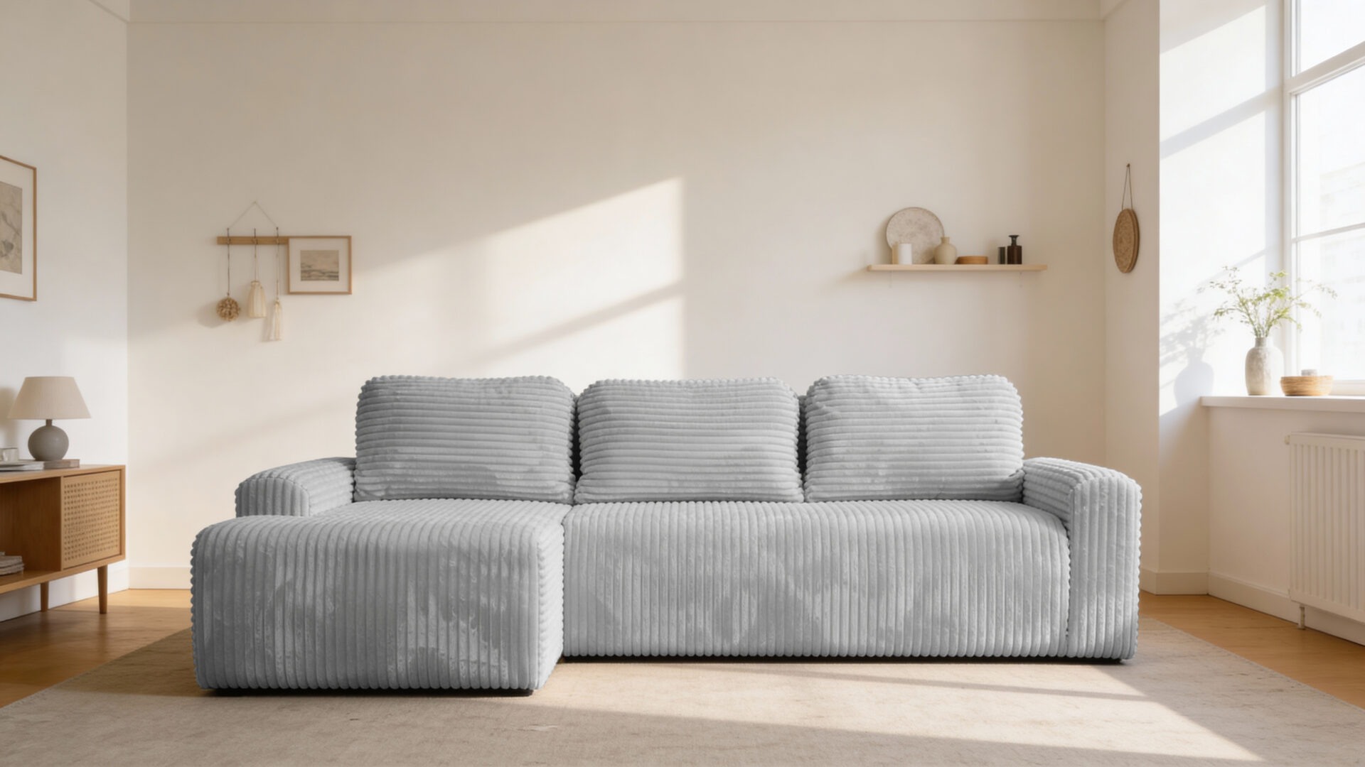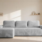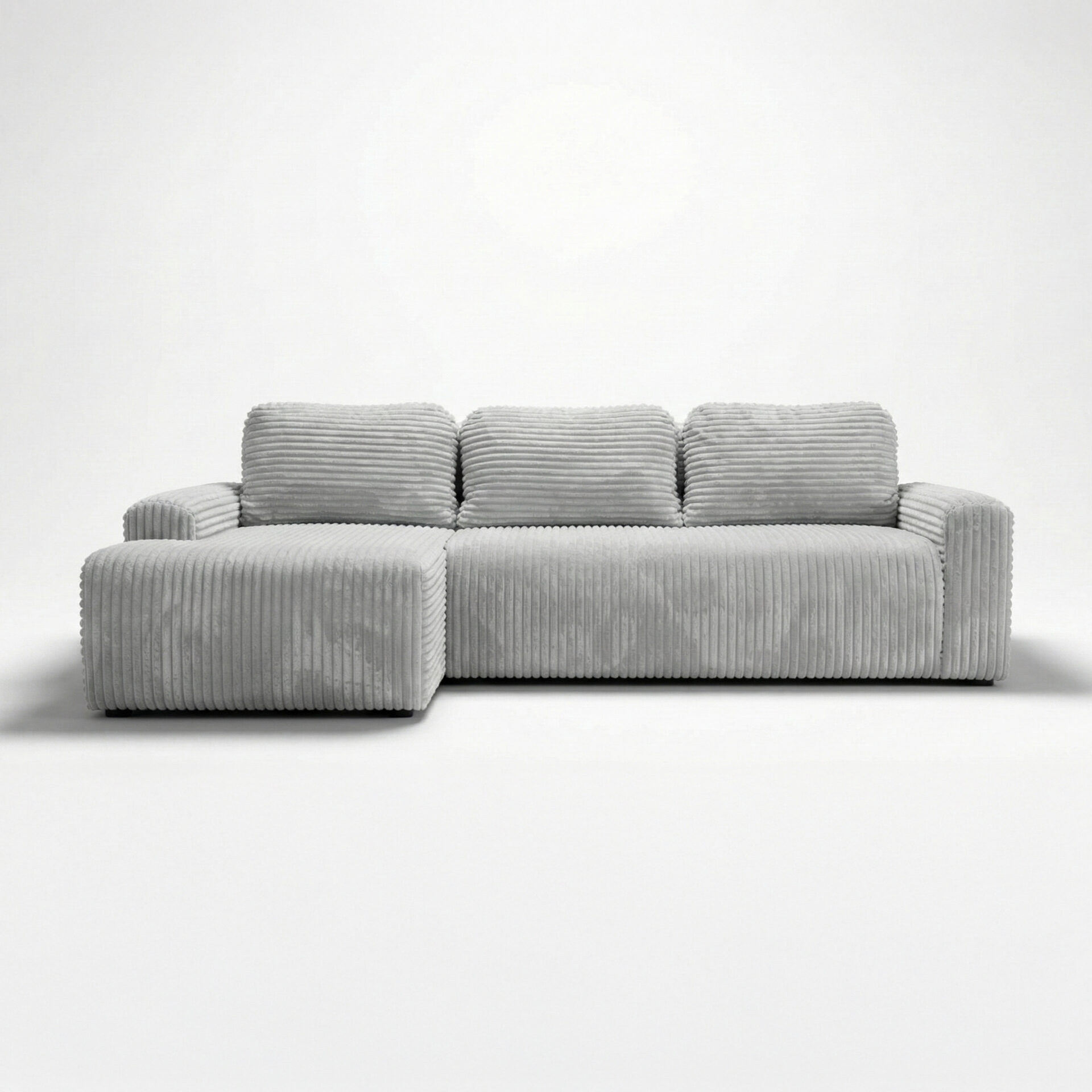 Narożnik Nesso w eleganckim, jasnoszarym odcieniu zachwyca wyjątkowo miękką, sztruksową tkaniną o wyraźnej, przytulnej fakturze.