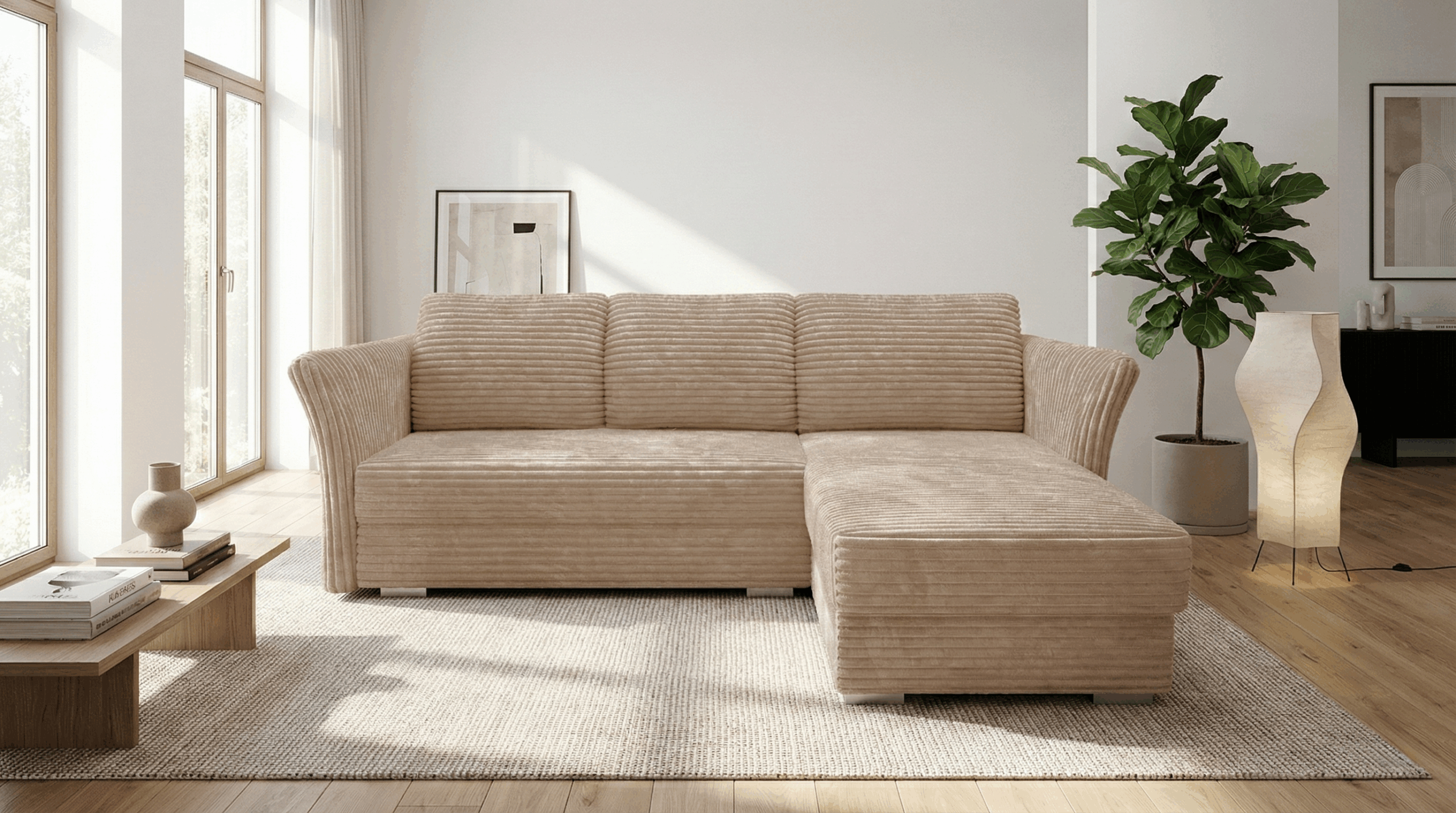 Narożnik wyposażono w praktyczną funkcję spania. Rozkładanie za pomocą automatu DL jest szybkie i nie wymaga wysiłku. W ten sposób w kilka chwil można przygotować komfortowe miejsce do spania dla gości. Duży pojemnik na pościel pomaga utrzymać porządek w salonie. Przechowasz w nim kołdrę, poduszki lub dodatkowe koce. Beżowy narożnik Merino obito tkaniną sztruksową przyjazną zwierzętom oraz środowisku. Materiał utrudnia wchłanianie cieczy, a ewentualne zabrudzenia można łatwo usunąć samą wodą.