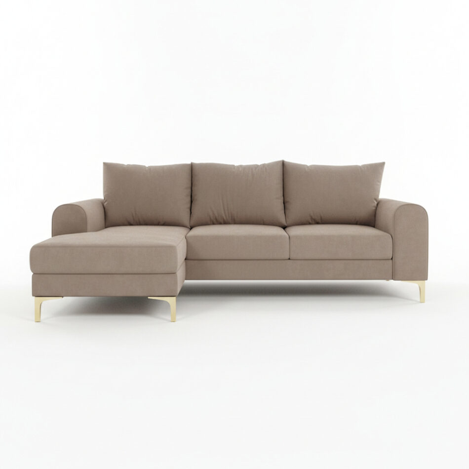 Jego przemyślana forma w kształcie litery L idealnie organizuje przestrzeń dzienną. Wysokie, złote nóżki dodają konstrukcji wizualnej lekkości. Dlatego świetnie pasuje do aranżacji w stylu nowoczesnym oraz boho. Subtelny beżowy odcień tkaniny tworzy w pomieszczeniu ciepłą i przytulną atmosferę. Stanowi on doskonałą bazę dla dalszych dekoracji. Co ważne, tapicerowany tył pozwala na ustawienie mebla w dowolnym miejscu salonu.