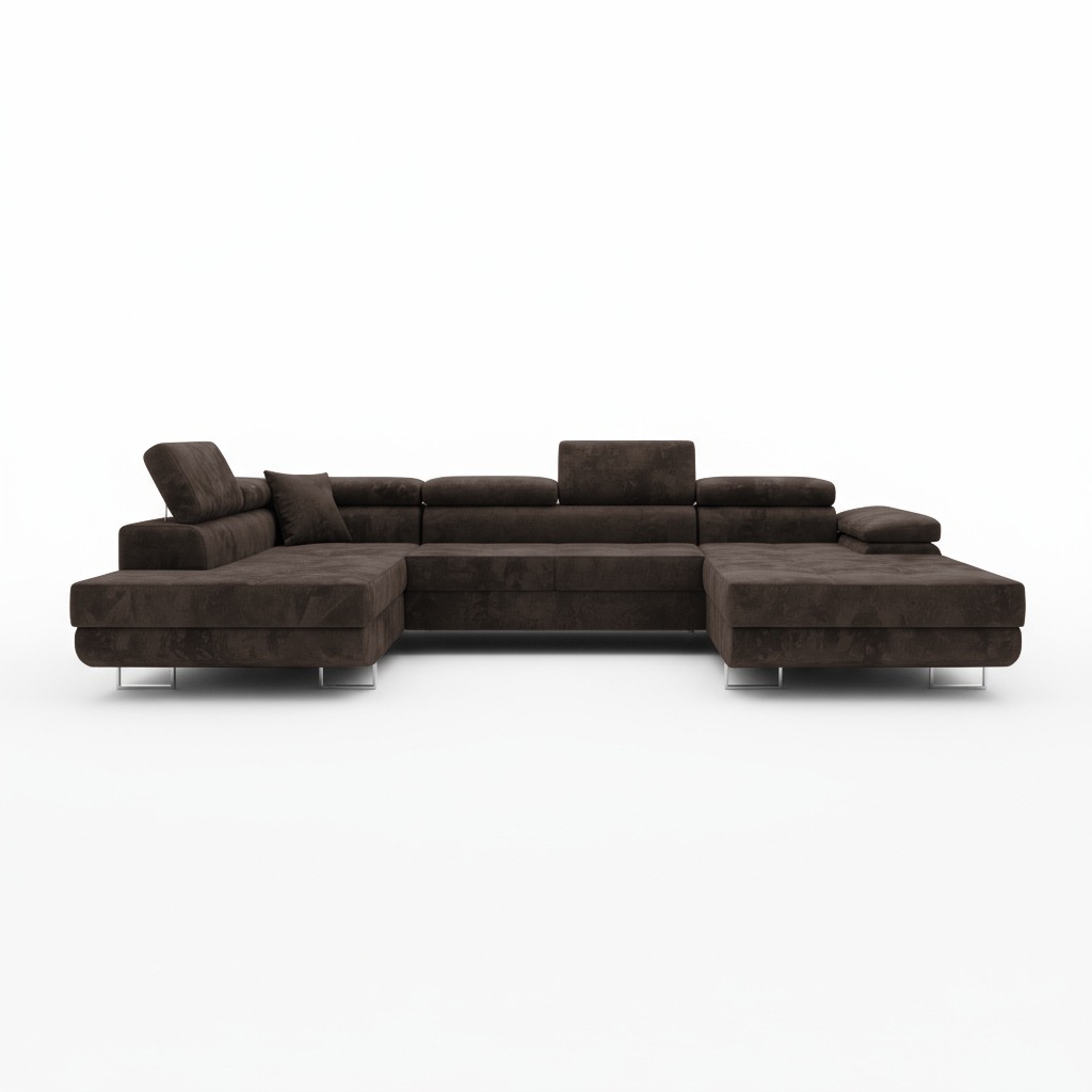 Jego imponujący kształt w formie litery U tworzy w salonie centralną strefę komfortu. Zaprasza do wspólnego spędzania czasu z rodziną i przyjaciółmi. Głęboki brązowy kolor obicia wnosi do wnętrza elegancję oraz ciepło. Dzięki temu salon staje się przytulną oazą spokoju, idealną do odpoczynku. Narożnik doskonale komponuje się z naturalnym drewnem lub nowoczesnymi, metalowymi dodatkami. Wysokie, chromowane nóżki dodają całej bryle wizualnej lekkości. Co ważne, tapicerowany tył pozwala na ustawienie mebla w dowolnym miejscu, nawet na środku pokoju.
