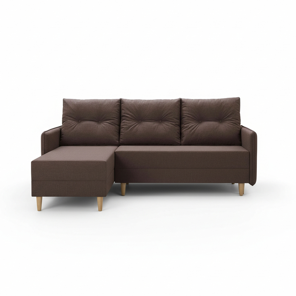 Jego klasyczna bryła w kształcie litery L została osadzona na wysokich, drewnianych nóżkach w odcieniu naturalnego buku. Dzięki temu mebel zyskuje wizualną lekkość i ponadczasowy charakter, który pasuje zarówno do nowoczesnych, jak i klasycznych aranżacji. Tapicerowany tył pozwala na swobodne ustawienie narożnika w dowolnym miejscu salonu, czyniąc go centralnym punktem domowego życia.