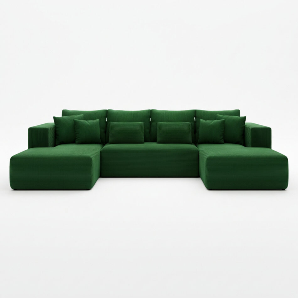 Jego obszerny kształt w formie litery U naturalnie tworzy centrum spotkań w salonie. Głęboki odcień butelkowej zieleni nadaje aranżacji szlachetności. Wprowadza do wnętrza spokój i poczucie bliskości z naturą. Dlatego doskonale pasuje do estetyki nowoczesnej oraz boho. Miękka, prążkowana tkanina sztruksowa dodaje całości przytulnego charakteru. Co ważne, mebel posiada tapicerowany tył. Pozwala to na ustawienie go w dowolnym miejscu, nawet na środku pokoju.