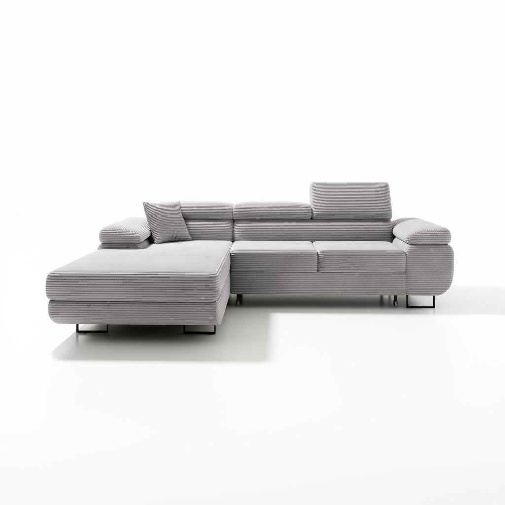 Narożnik Astorp L jest także niezwykle praktyczny. Funkcja spania z mechanizmem rozkładania za pomocą automatu Delfin pozwala szybko przygotować wygodne miejsce dla gości. Co ważne, pod siedziskiem ukryto pojemny schowek na pościel. Sztruksowa tkanina Poso jest przyjazna zwierzętom i ułatwia czyszczenie. Jej specjalna powłoka utrudnia wchłanianie rozlanych płynów. Szary kolor tapicerki sprawia, że codzienne użytkowanie staje się beztroskie.