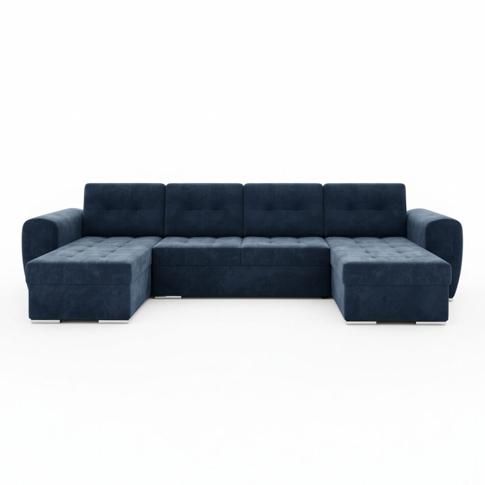 Jego symetryczny kształt litery U tworzy w salonie przytulną, otwartą przestrzeń do spotkań. Głęboki granatowy kolor obicia nadaje mu szlachetnego charakteru. Dzięki temu mebel doskonale odnajduje się zarówno w nowoczesnych, jak i klasycznych aranżacjach. Całość osadzono na niskich, metalowych nóżkach w kolorze chromu, które stanowią subtelny, stylowy akcent.