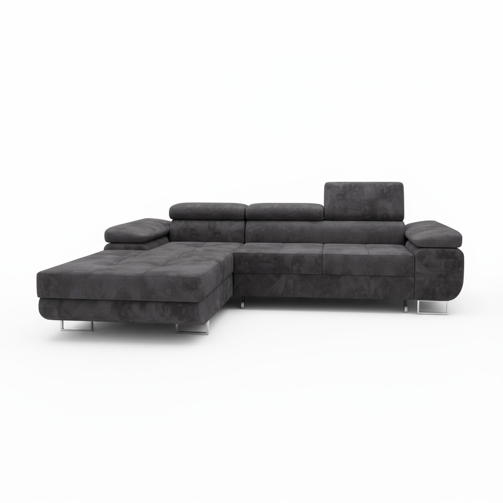 Jego przemyślana forma w kształcie litery L świetnie organizuje przestrzeń w salonie, tworząc komfortowe centrum spotkań. Głęboki, grafitowy odcień wprowadza do wnętrza atmosferę elegancji i spokoju. Dlatego doskonale pasuje zarówno do aranżacji klasycznych, jak i tych o minimalistycznym charakterze. Smukłe, chromowane nóżki dodają konstrukcji wizualnej lekkości. Co ważne, tapicerowany tył pozwala ustawić mebel w dowolnym miejscu, nawet na środku pokoju.