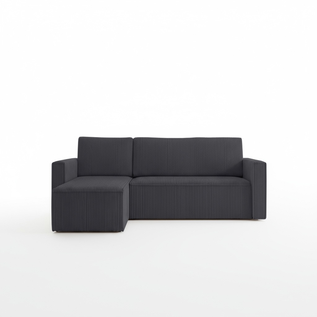 Jego kształt w formie litery L świetnie organizuje przestrzeń, tworząc idealne miejsce do odpoczynku. Głęboki, grafitowy odcień tapicerki jest niezwykle uniwersalny. Dlatego łatwo dopasujesz go do wnętrz w stylu klasycznym i nowoczesnym. Całość pokrywa miękka tkanina sztruksowa Poso o wyraźnej fakturze. Jej prążkowana struktura dodaje wnętrzu ciepła i wizualnej głębi. Co ważne, tapicerowany tył pozwala ustawić mebel w dowolnym miejscu pokoju.
