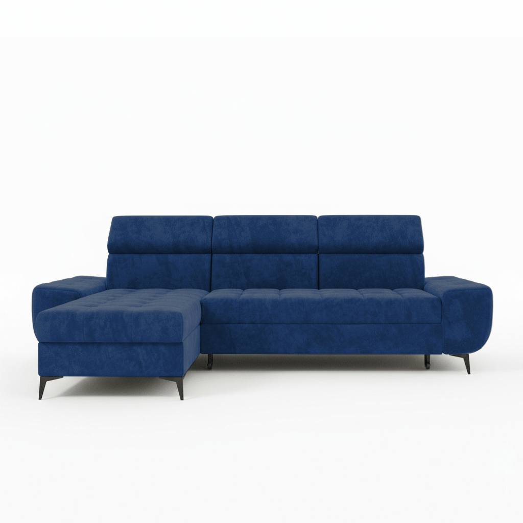 Jego projekt opiera się na prostych liniach i eleganckiej formie w kształcie litery L. Wysokie, czarne metalowe nóżki dodają całej konstrukcji wizualnej lekkości. Głęboki granatowy odcień tapicerki wprowadza do salonu atmosferę spokoju i wyrafinowania. Dlatego mebel staje się wyrazistym akcentem, który pięknie komponuje się z drewnem lub metalowymi dodatkami. Co ważne, tapicerowany tył pozwala na ustawienie narożnika w dowolnym miejscu pokoju.