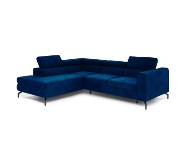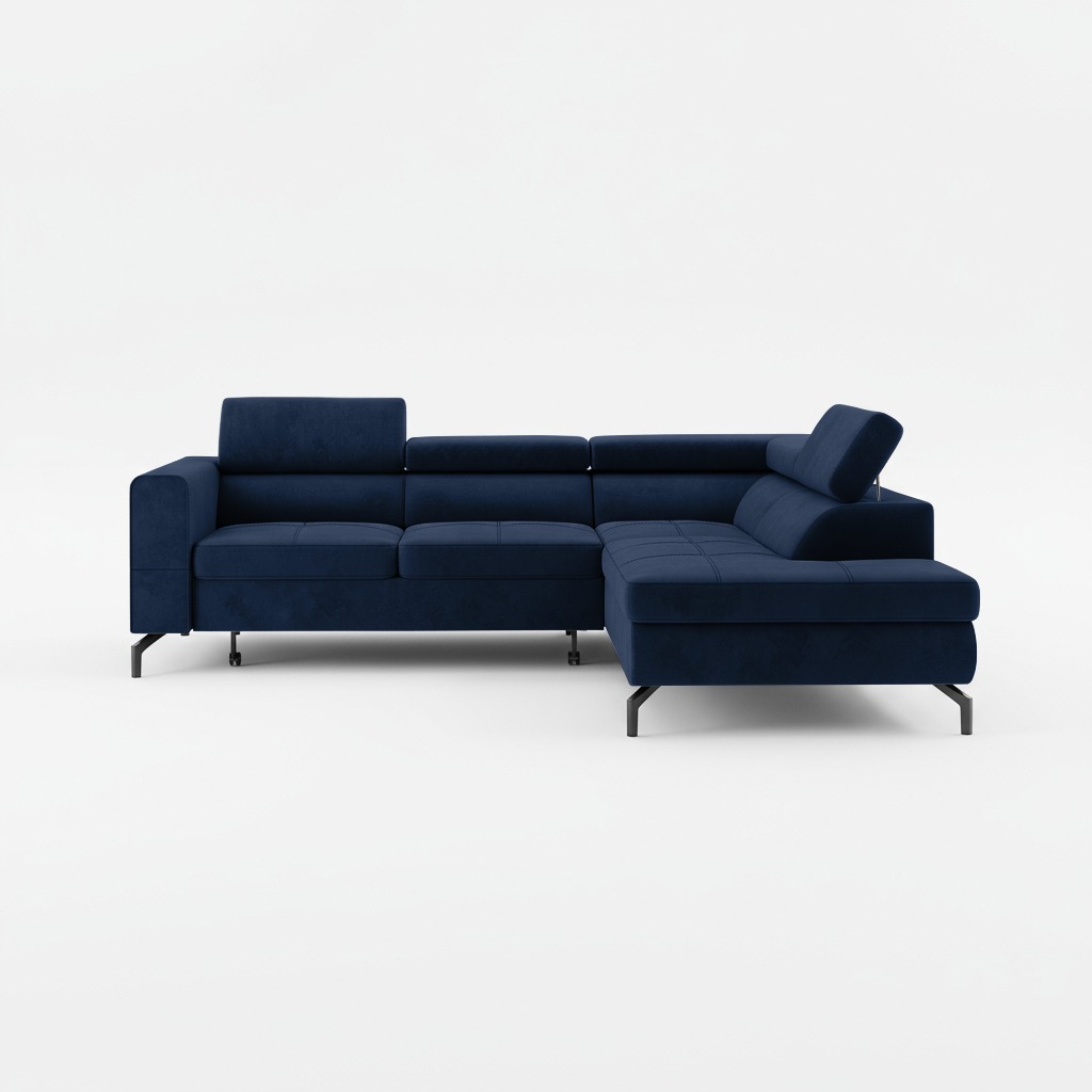 Jego ponadczasowa bryła w kształcie litery L z łatwością dopasuje się do każdego salonu. Konstrukcję osadzono na wysokich, czarnych metalowych nóżkach. Dzięki temu mebel nabiera wizualnej lekkości. Głęboki granatowy kolor tapicerki tworzy we wnętrzu spokojną i elegancką atmosferę. Dlatego narożnik staje się doskonałą bazą dla aranżacji nowoczesnych oraz klasycznych.