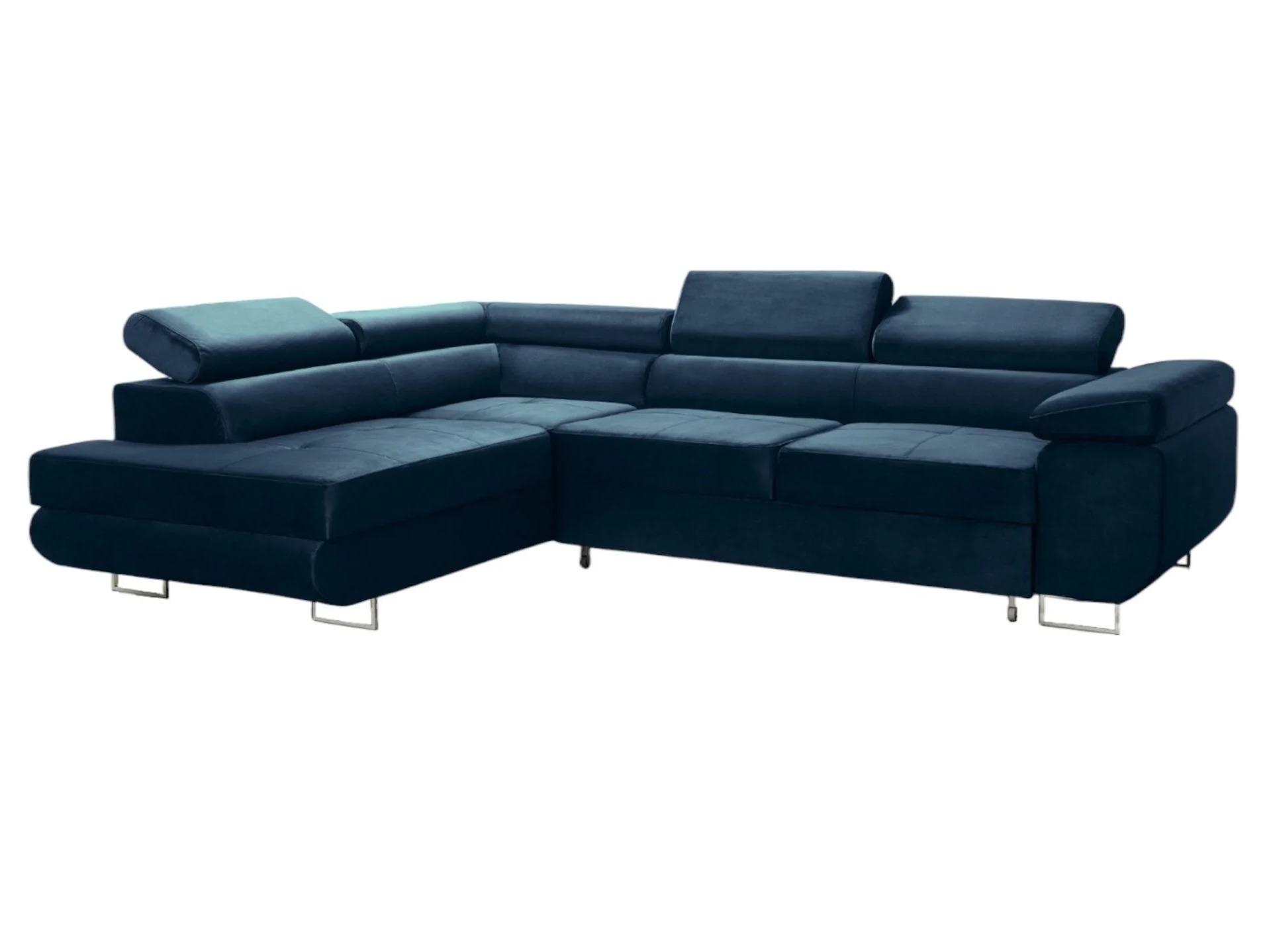 Jego prosty, elegancki design został podkreślony przez wysokie, chromowane nóżki. W ten sposób bryła zyskuje wizualną lekkość i doskonale wpisuje się we współczesne aranżacje. Głęboki, granatowy kolor tapicerki wprowadza do salonu atmosferę spokoju i wyrafinowania. Dzięki temu wnętrze staje się przytulne, a jednocześnie pełne klasy. Narożnik Avesta w kształcie litery L świetnie odnajdzie się zarówno w minimalistycznych, jak i bardziej odważnych przestrzeniach.