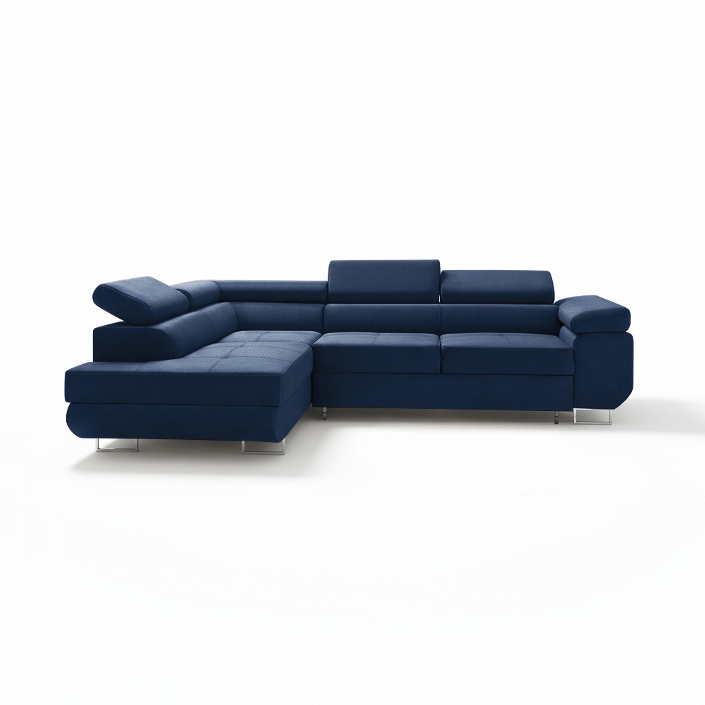 Komfort codziennego użytkowania zapewniają regulowane zagłówki. Pozwalają one na idealne dopasowanie podparcia podczas wieczornego seansu filmowego lub czytania książki. Siedzisko wypełnione sprężynami falistymi i pianką jest elastyczne oraz odporne na odkształcenia. Dlatego mebel gwarantuje wygodny odpoczynek po długim dniu pracy. Co ważne, tapicerowany tył pozwala ustawić narożnik w dowolnym miejscu, nawet na środku pokoju.