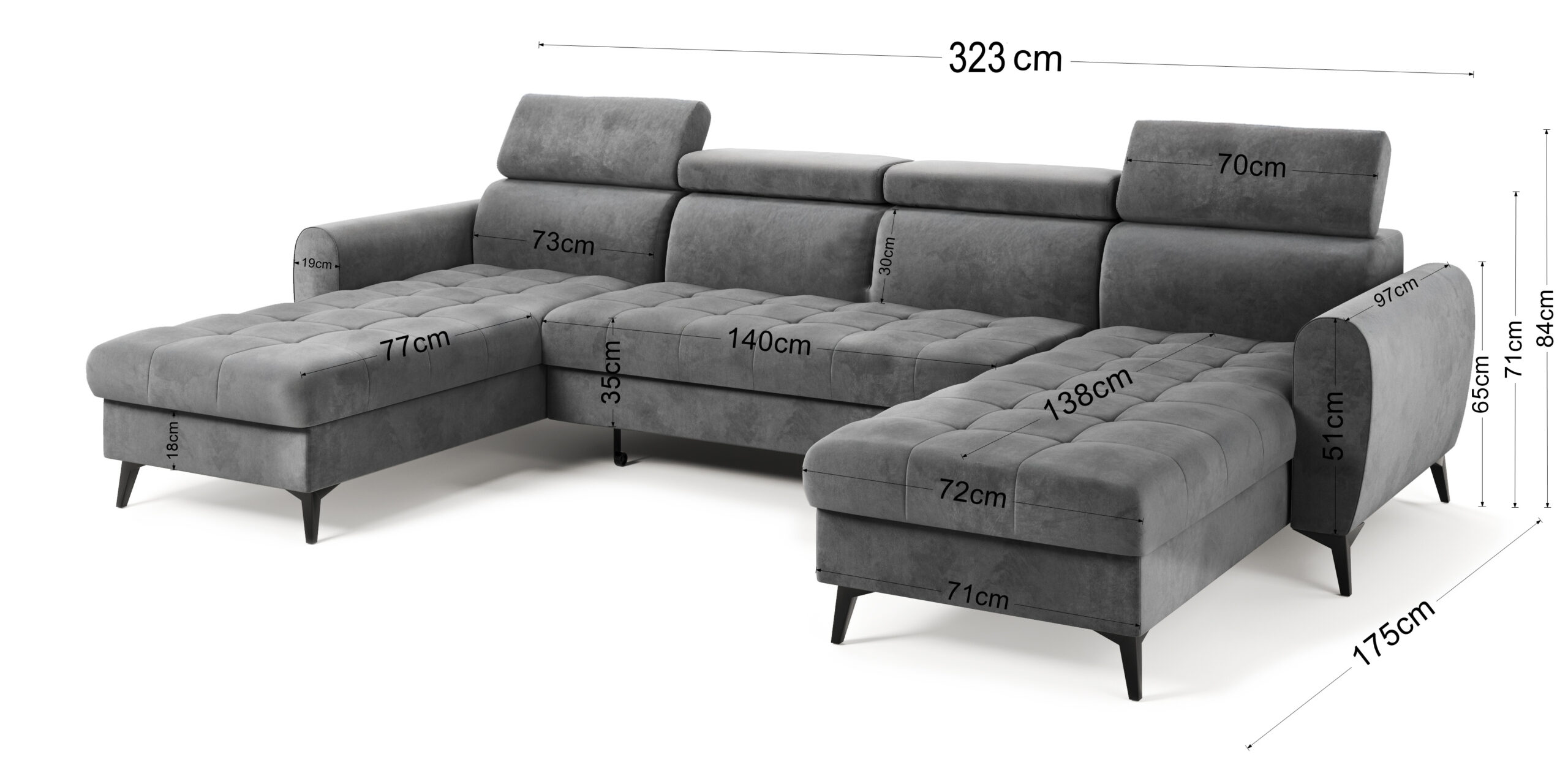 Dzięki starannie wykończonemu, tapicerowanemu tyłowi, narożnik doskonale prezentuje się z każdej strony. Możesz ustawić go swobodnie w dowolnym miejscu salonu – nawet na środku – tworząc elegancką, funkcjonalną strefę wypoczynku. To idealne rozwiązanie dla tych, którzy cenią nie tylko komfort, ale i estetykę wnętrza.