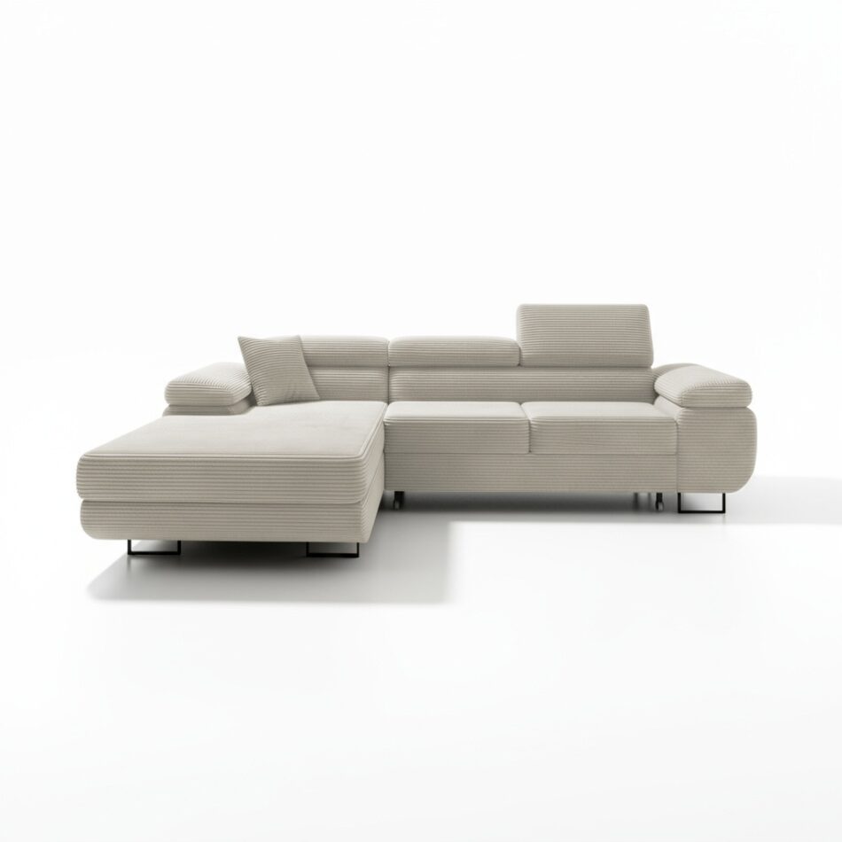 Siedzisko wypełnione sprężynami falistymi i elastyczną pianką zapewnia optymalny komfort. Dlatego narożnik jest idealnym miejscem do relaksu po długim dniu. Regulowane zagłówki pozwalają dopasować wysokość oparcia do indywidualnych potrzeb. W ten sposób można wygodnie oprzeć głowę podczas czytania książki lub oglądania filmu. Co ważne, sztruksowa tkanina Poso jest niezwykle przyjemna w dotyku. Jest także przyjazna zwierzętom, a jej właściwości ułatwiają utrzymanie czystości na co dzień.
