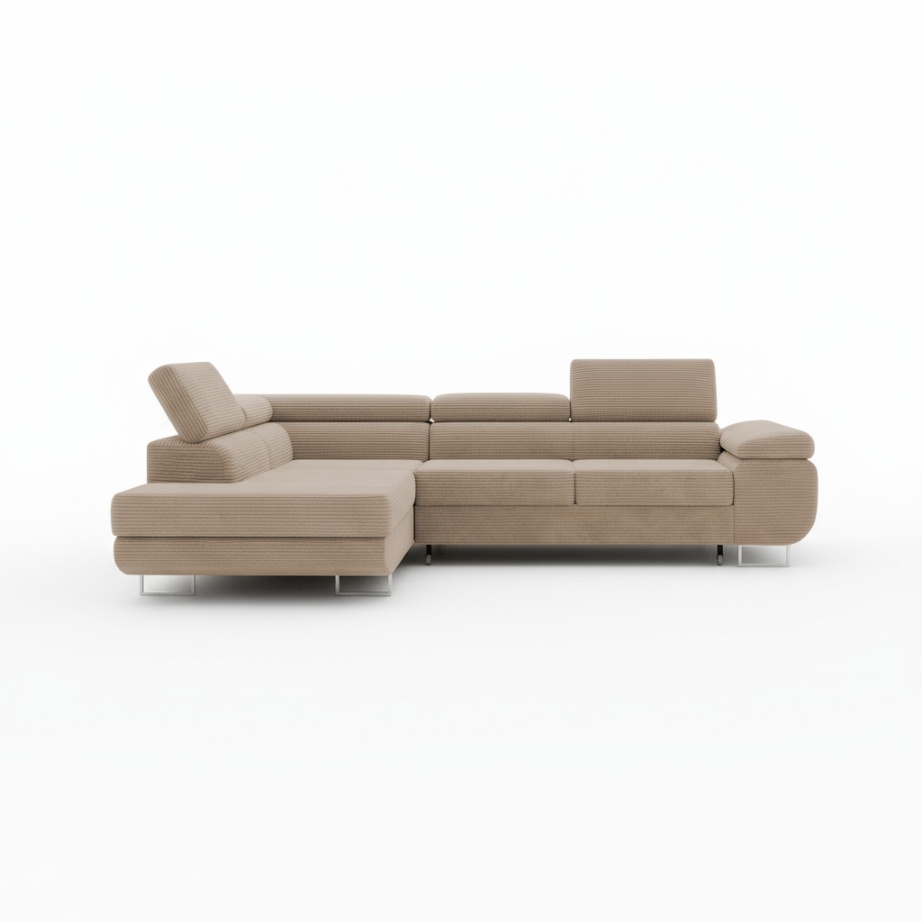Komfort wypoczynku zapewniają regulowane zagłówki. Pozwalają one na idealne dopasowanie podparcia podczas czytania książki lub wieczornego seansu filmowego. Siedzisko wypełnione sprężynami falistymi i elastyczną pianką jest przyjemnie sprężyste. Gwarantuje stabilne oparcie dla ciała i wygodę przez długie lata użytkowania. W ten sposób każdy moment spędzony na narożniku staje się chwilą prawdziwego odprężenia.