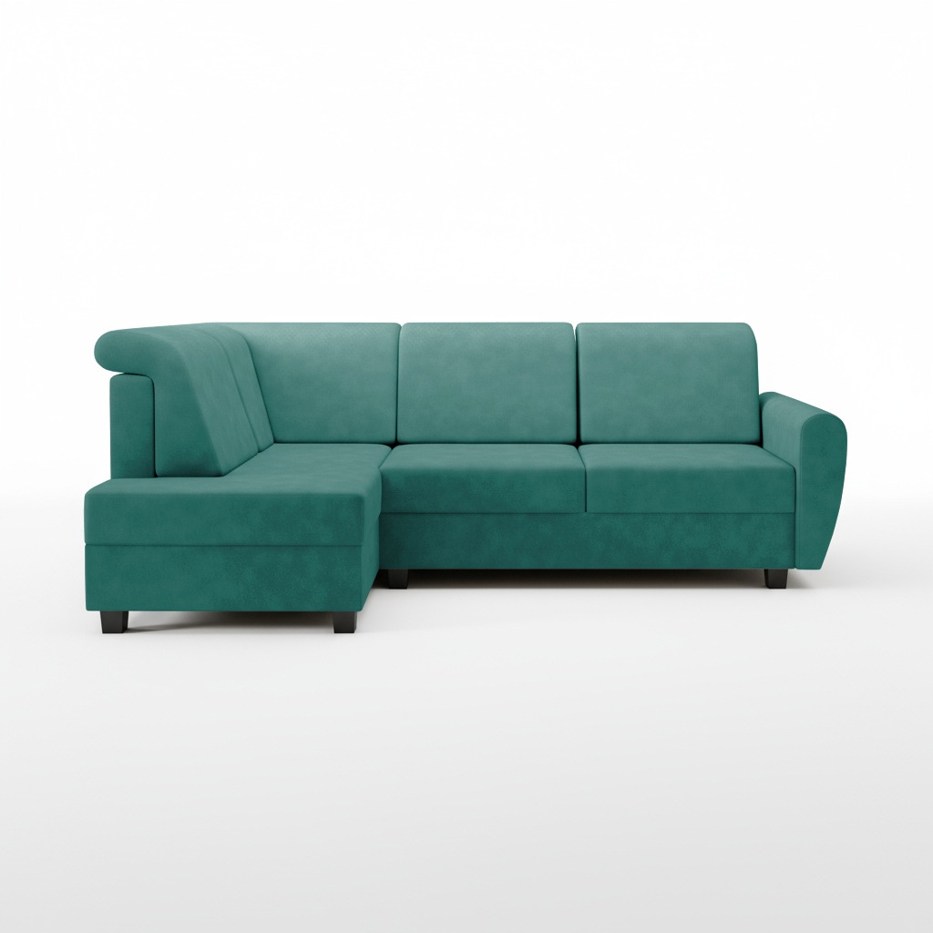 Model zaprojektowano w kształcie litery L. Dzięki temu z łatwością wyznacza on strefę relaksu w pokoju dziennym. Minimalistyczną bryłę osadzono na niskich, drewnianych nóżkach w kolorze wenge. Stanowią one subtelny, elegancki detal. Co ważne, narożnik posiada tapicerowany tył. W ten sposób można go swobodnie ustawić w dowolnym miejscu, nawet na środku pomieszczenia. Jego turkusowy kolor świetnie komponuje się z odcieniami szarości, bieli oraz naturalnego drewna.