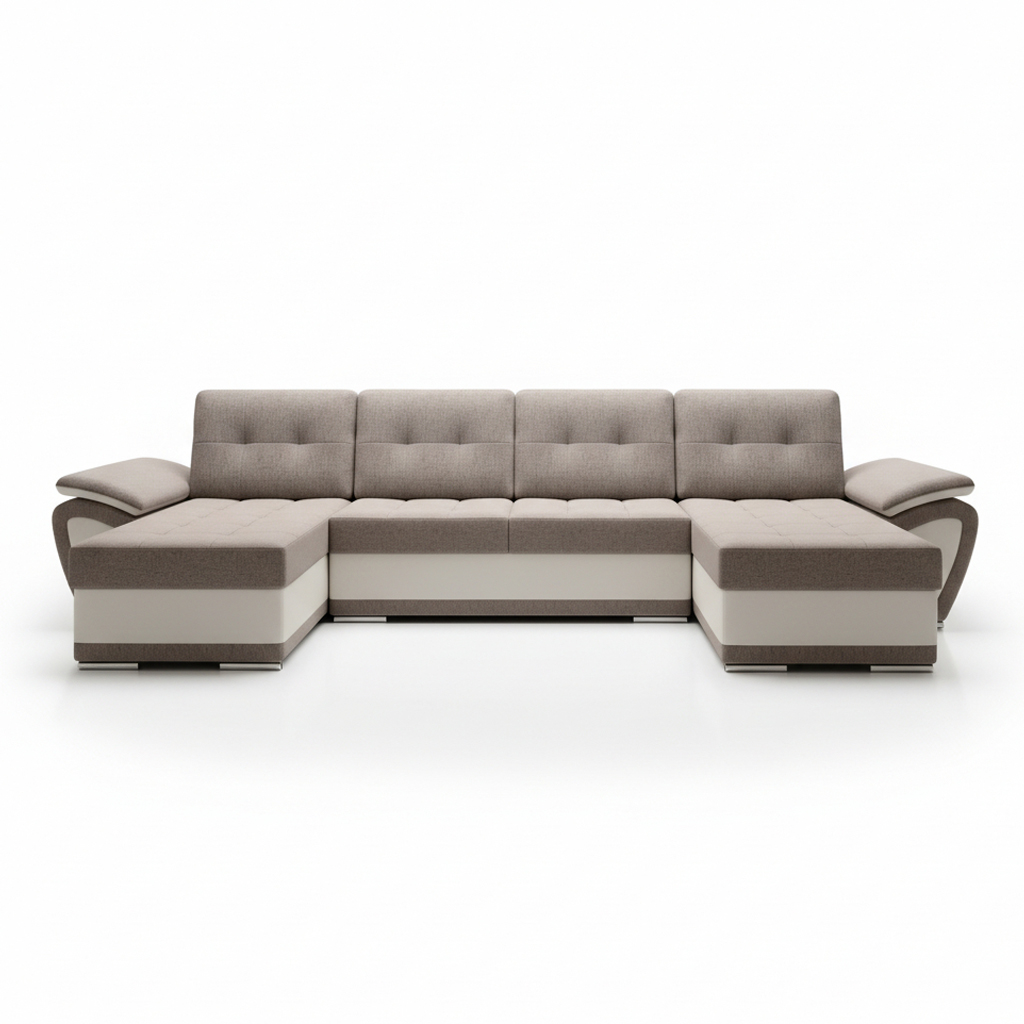 Jego symetryczna forma tworzy w salonie idealną przestrzeń do spotkań z rodziną i przyjaciółmi. Ustawny kształt litery U naturalnie integruje domowników, zachęcając do wspólnych rozmów. Ciepły, beżowy odcień tapicerki wprowadza do wnętrza spokój i poczucie przytulności. Dzięki temu mebel doskonale komponuje się z aranżacjami w stylu nowoczesnym oraz klasycznym. Chromowane nóżki dodają całości subtelnej elegancji. Co ważne, tapicerowany tył pozwala na ustawienie narożnika w dowolnym miejscu pokoju.