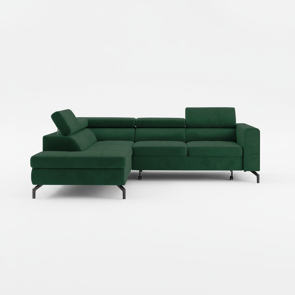 Jego nowoczesny design opiera się na prostych liniach oraz wysokich, czarnych nóżkach z metalu. Kształt litery L pozwala na wygodne zaaranżowanie przestrzeni w salonie, tworząc idealne miejsce do odpoczynku. Głęboki odcień butelkowej zieleni wprowadza do wnętrza spokój i elegancję. Dlatego narożnik świetnie komponuje się z drewnem, złotymi dodatkami czy jasnymi ścianami, nadając pomieszczeniu przytulny i wyrafinowany charakter. Co ważne, tapicerowany tył mebla umożliwia ustawienie go w dowolnym miejscu, nawet na środku pokoju.