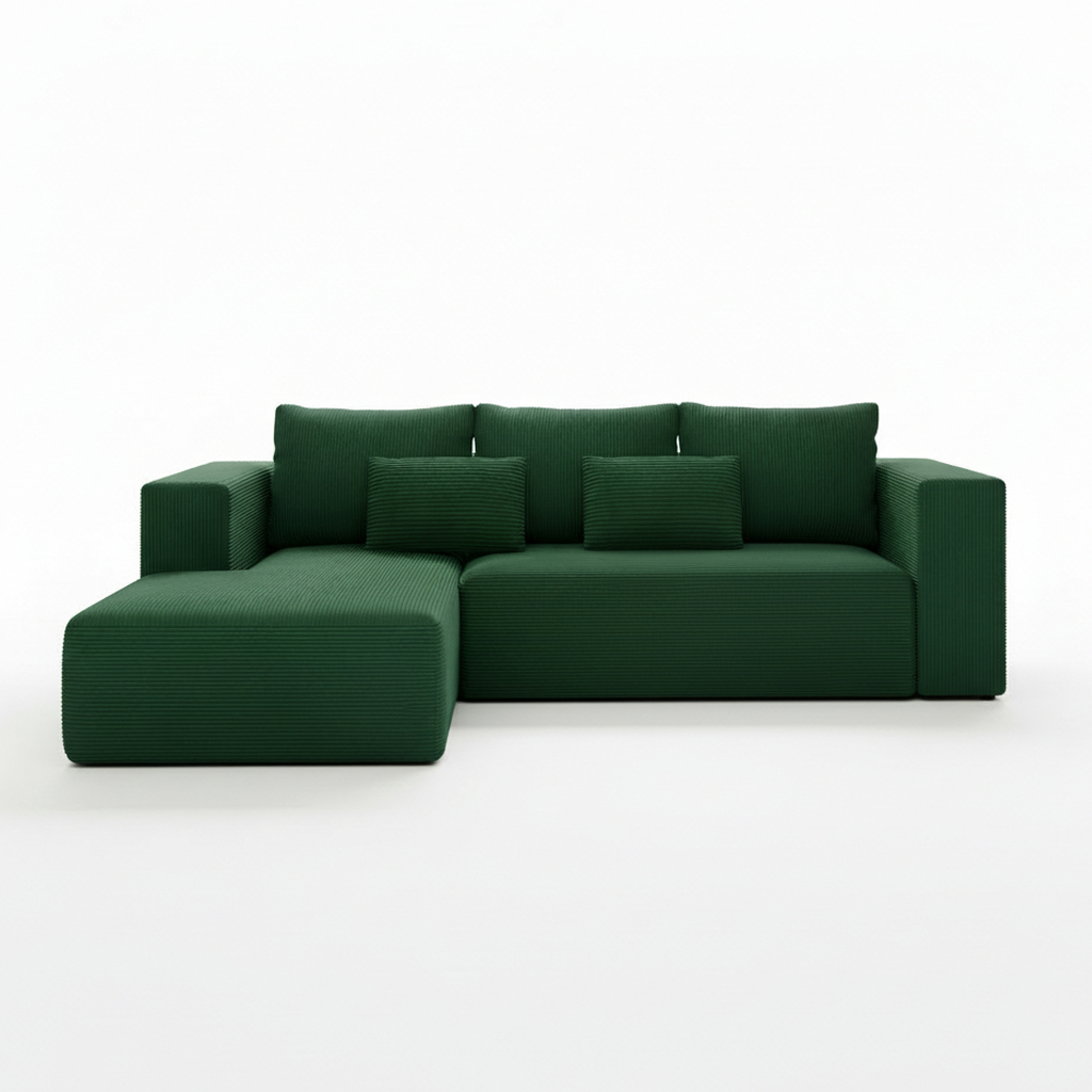 Jego bryła w kształcie litery L idealnie organizuje przestrzeń w salonie. Głęboki odcień butelkowej zieleni nadaje wnętrzu elegancji i szlachetnego spokoju. Dlatego mebel staje się wyrazistym, a zarazem przytulnym centrum domowego życia. Co ważne, tapicerowany tył pozwala ustawić go w dowolnym miejscu. W ten sposób doskonale prezentuje się nawet na środku pokoju.
