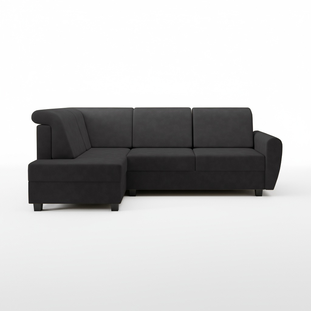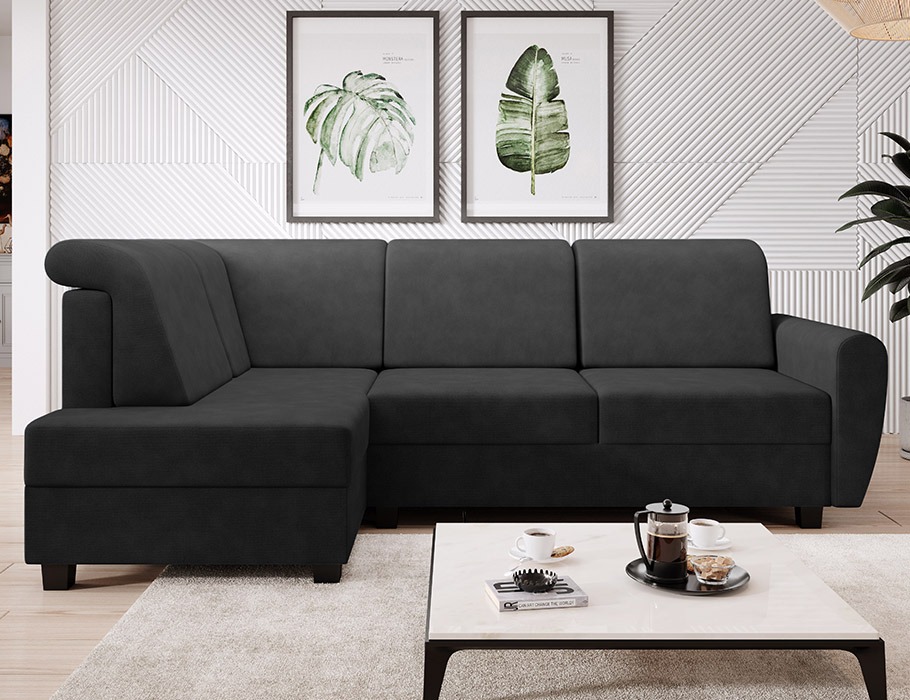Jego forma w kształcie litery L doskonale organizuje przestrzeń w salonie. Głęboka czerń obicia nadaje wnętrzu elegancji i wyrazistego charakteru. Dlatego świetnie odnajduje się w aranżacjach minimalistycznych oraz loftowych, tworząc mocny, stylowy akcent. Subtelnym detalem są solidne, niskie nóżki z drewna w kolorze wenge. Co ważne, tył mebla również pokryto tkaniną. Dzięki temu narożnik prezentuje się nienagannie z każdej strony.