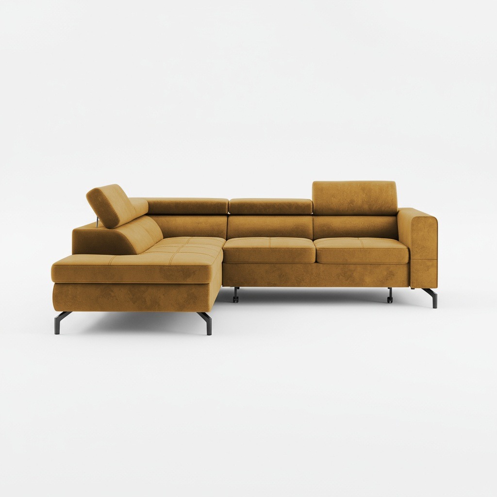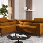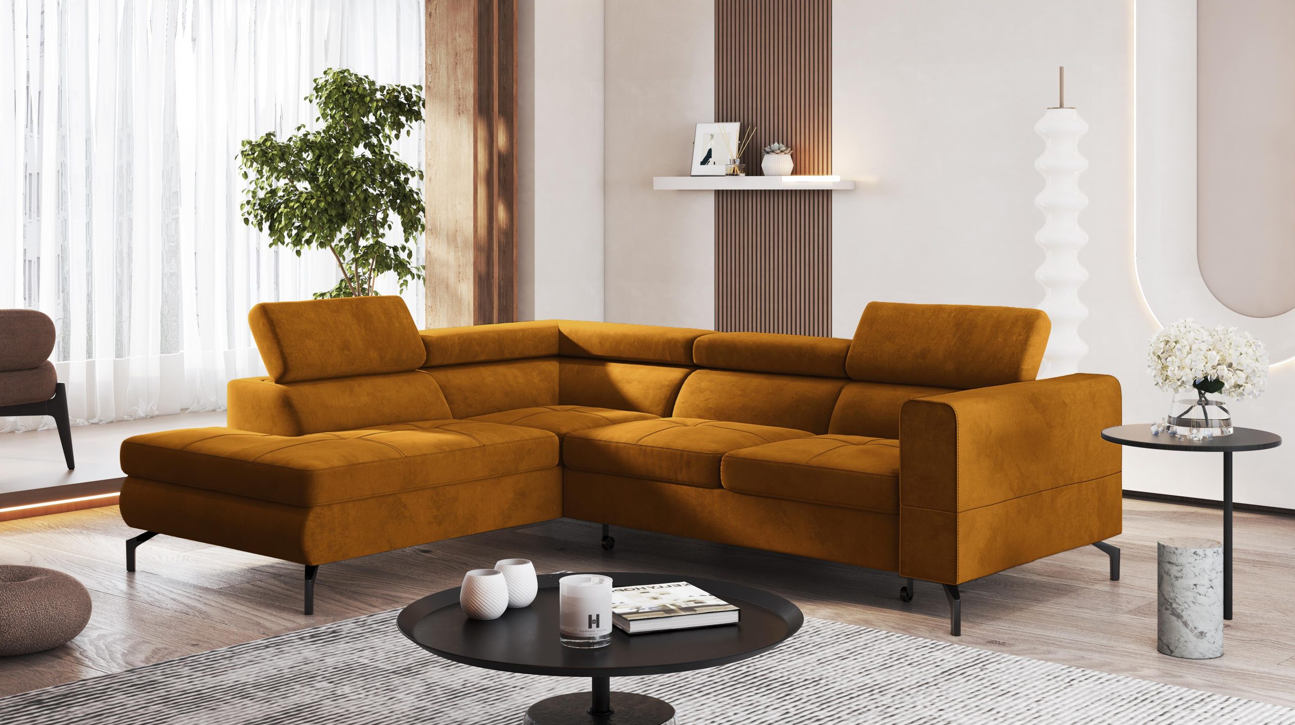 Jego nowoczesny design opiera się na prostych liniach i eleganckiej formie w kształcie litery L. Całość uniesiono na wysokich, czarnych nóżkach. W ten sposób bryła zyskuje wizualną lekkość. Energetyczny, musztardowy kolor tkaniny wprowadza do wnętrza ciepłą i optymistyczną atmosferę. Dlatego narożnik świetnie ożywi minimalistyczne aranżacje lub dopełni te w stylu klasycznym.
