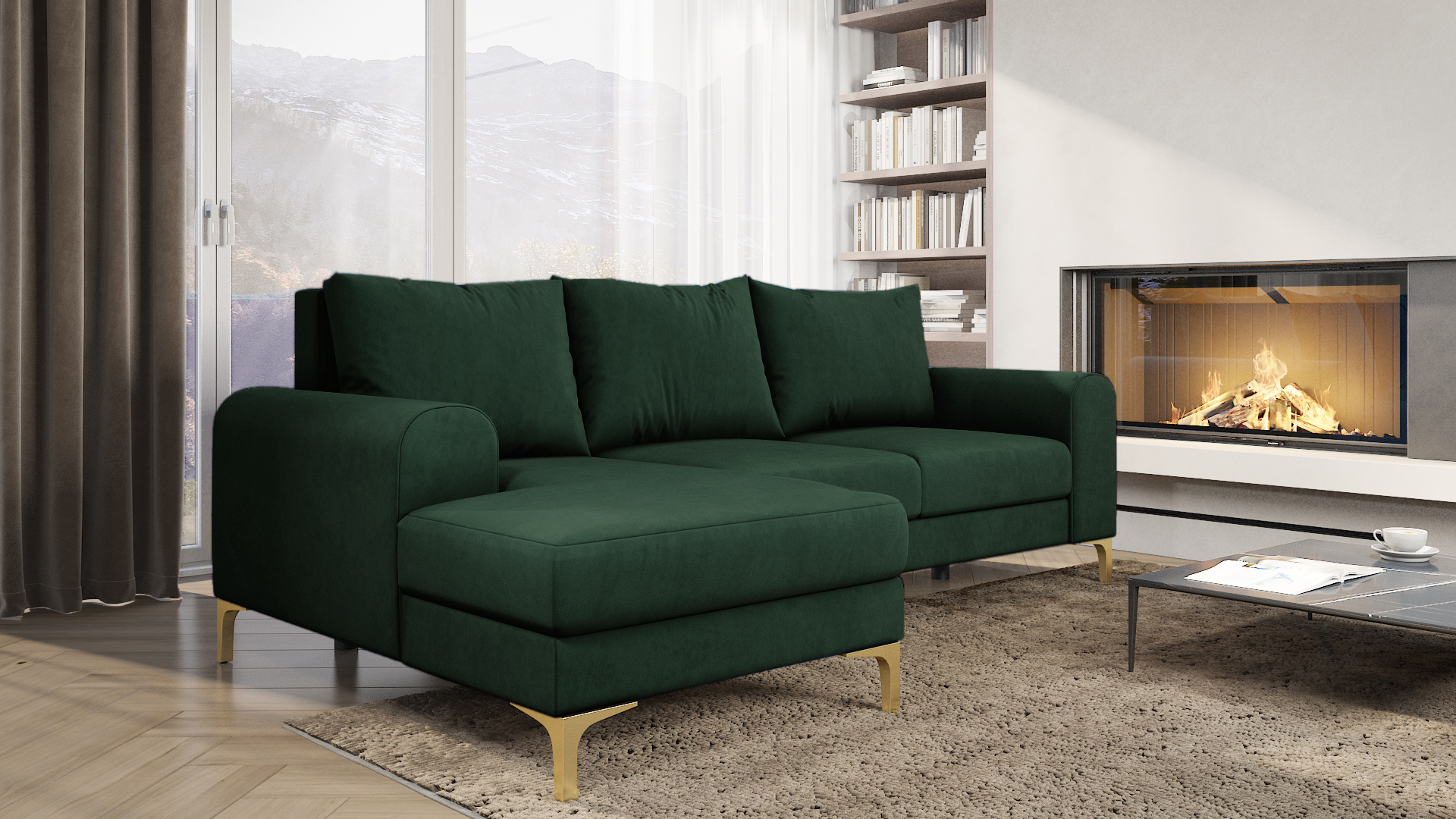 Narożnik Instra w odcieniu butelkowej zieleni to mebel otulony aksamitnym w dotyku welurem.
