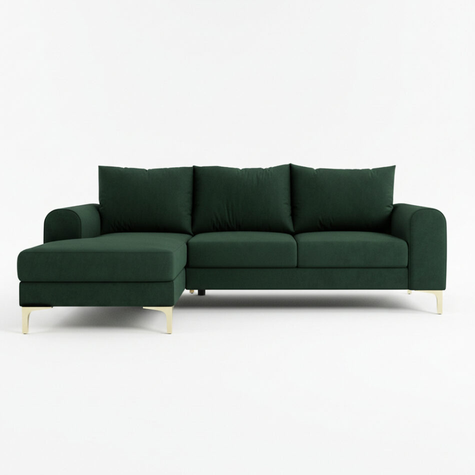 Jego bryła w kształcie litery L subtelnie wpisuje się w aranżacje nowoczesne oraz inspirowane stylem boho. Głęboki, szlachetny odcień butelkowej zieleni tworzy we wnętrzu atmosferę spokoju i bliskości z naturą. Kolor ten doskonale komponuje się z ciepłem drewna, złotymi dodatkami czy domową roślinnością. Dzięki temu salon staje się przytulną oazą wypoczynku. Wysokie, czarne nóżki dodają konstrukcji wizualnej lekkości, a tapicerowany tył pozwala ustawić mebel w dowolnym miejscu pokoju.