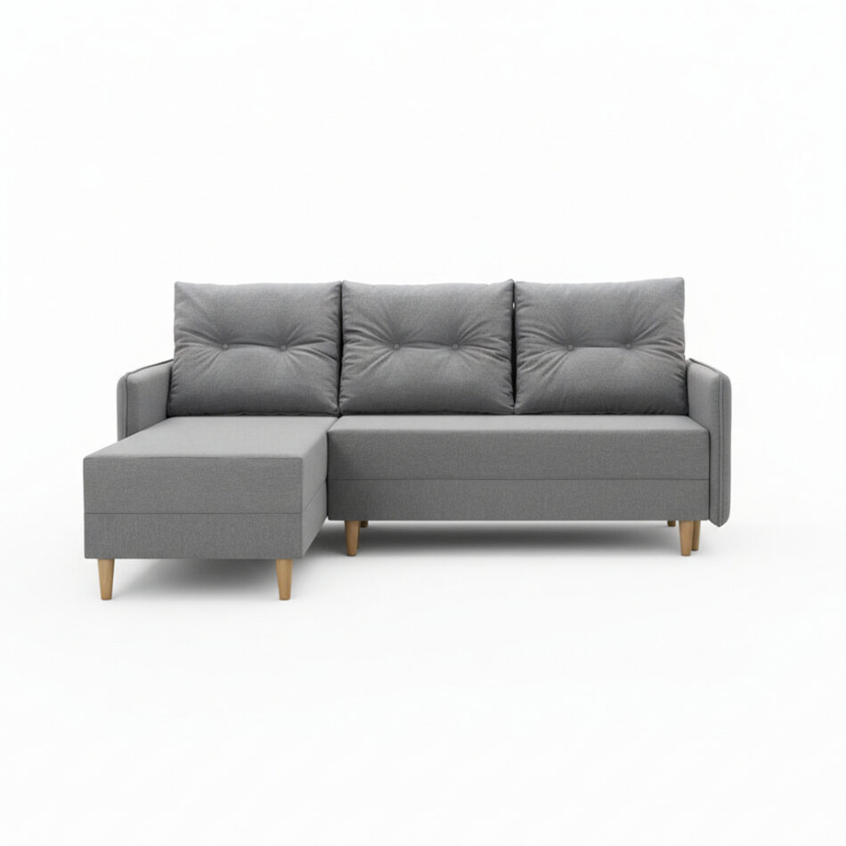 Jego L-kształtny układ wsparty na wysokich, drewnianych nóżkach nadaje wnętrzu lekkości. Tapicerowany tył mebla pozwala na swobodną aranżację przestrzeni, nawet na środku salonu. Jasnoszary odcień tapicerki jest przy tym niezwykle uniwersalny. Dzięki niemu pokój dzienny staje się jaśniejszy i spokojniejszy. Pasuje zarówno do aranżacji minimalistycznych, jak i tych inspirowanych stylem skandynawskim.