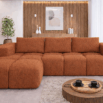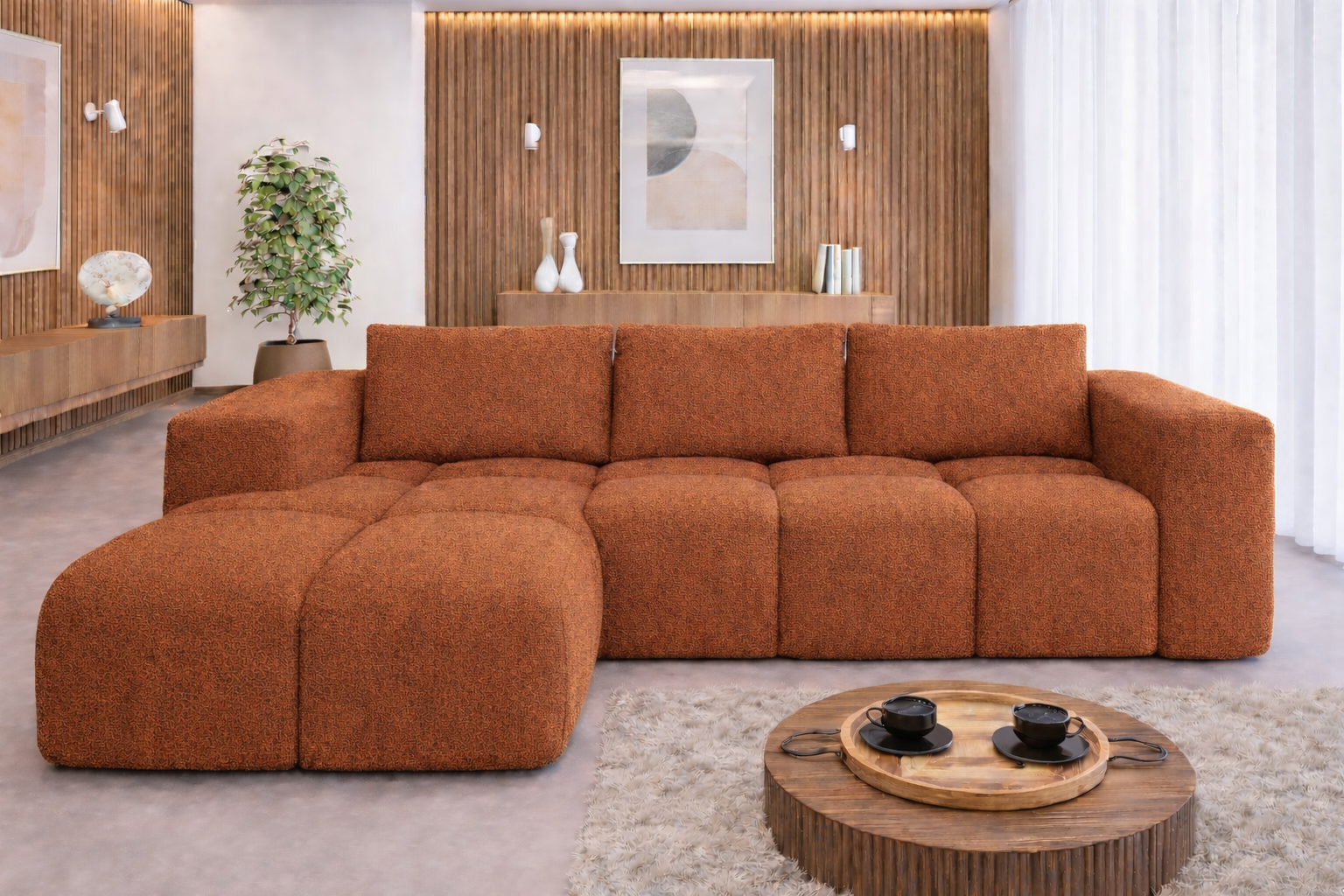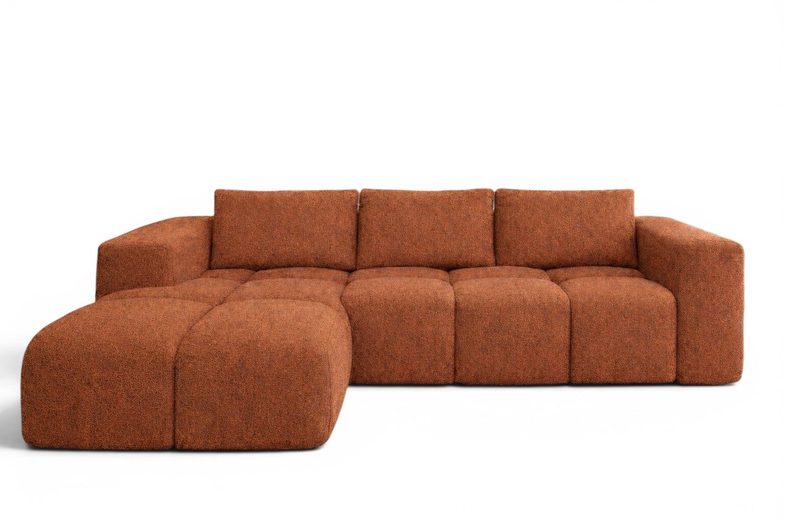 Miedziany narożnik Flavio wprowadza do wnętrza nowoczesny styl i przytulność tkaniny o splocie plecionki.