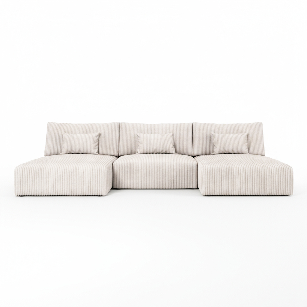 Jego imponujący kształt litery U tworzy idealną przestrzeń do spotkań w gronie rodziny lub przyjaciół. Delikatny, kremowy odcień wprowadza do wnętrza spokój i poczucie przytulności. Dzięki temu salon staje się jaśniejszy oraz bardziej przestronny. Barwa ta stanowi doskonałą bazę dla aranżacji w stylu skandynawskim lub minimalistycznym. Co ważne, tapicerowany tył mebla pozwala ustawić go w dowolnym miejscu, także na środku pokoju, bez obaw o estetykę.