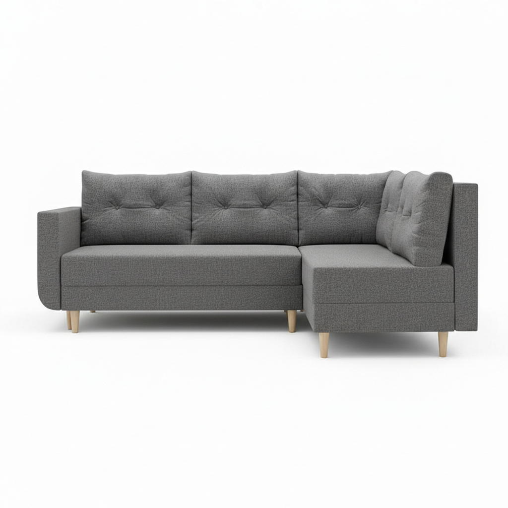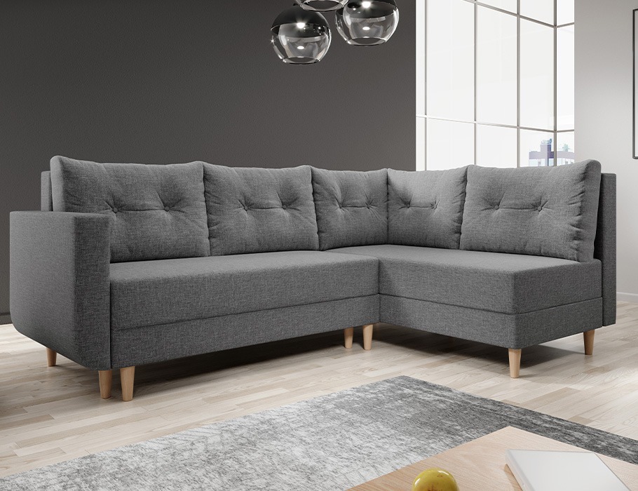 Siedzisko wypełnione sprężynami bonellowymi zapewnia stabilne i wygodne podparcie. Dzięki temu idealnie sprawdza się podczas długich wieczorów z książką lub seansu filmowego. Pięć dużych poduszek oparciowych pozwala ułożyć się w ulubionej pozycji. W ten sposób mebel staje się przytulnym centrum domowego relaksu. Narożnik wyposażono w intuicyjną funkcję spania. W kilka chwil zmienia się w wygodne łóżko dla gości. Praktyczny pojemnik na pościel pomaga z kolei utrzymać porządek w salonie.