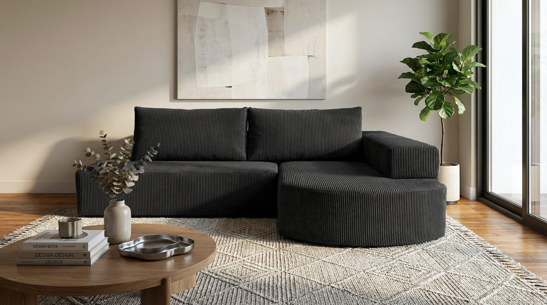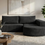Tapicerka wykonana z wysokiej jakości, miękkiej tkaniny sztruksowej o wyraźnej strukturze nadaje narożnikowi przytulny wygląd i podkreśla jego nowoczesny styl. Materiał jest przyjemny w dotyku, trwały i łatwy w codziennym użytkowaniu, dzięki czemu mebel zachowuje estetyczny wygląd przez długi czas.