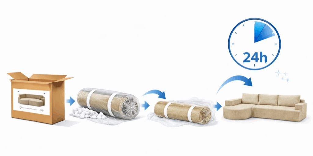 Nasze meble piankowe (sofy, narożniki, fotele) polskiej produkcji są standardowo kompresowane na czas transportu, co pozwala na bezpieczne dostarczenie oraz ułatwia wniesienie do mieszkania. Po rozpakowaniu produkt stopniowo wraca do swojego pierwotnego kształtu i pełnego komfortu użytkowania w ciągu około 24 godzin.