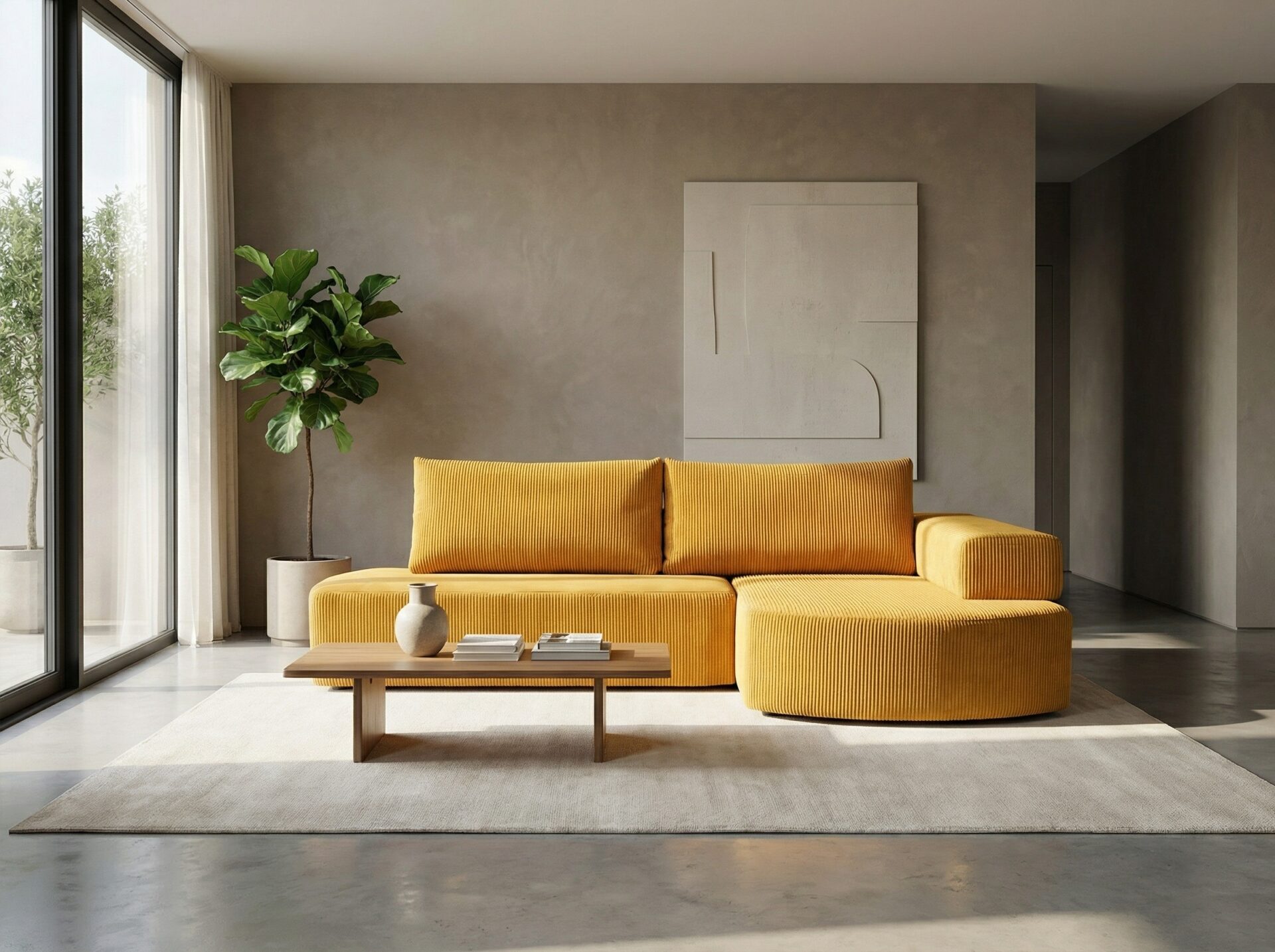 Tapicerka wykonana z wysokiej jakości, miękkiej tkaniny sztruksowej o wyraźnej strukturze nadaje narożnikowi przytulny wygląd i podkreśla jego nowoczesny styl. Materiał jest przyjemny w dotyku, trwały i łatwy w codziennym użytkowaniu, dzięki czemu mebel zachowuje estetyczny wygląd przez długi czas.