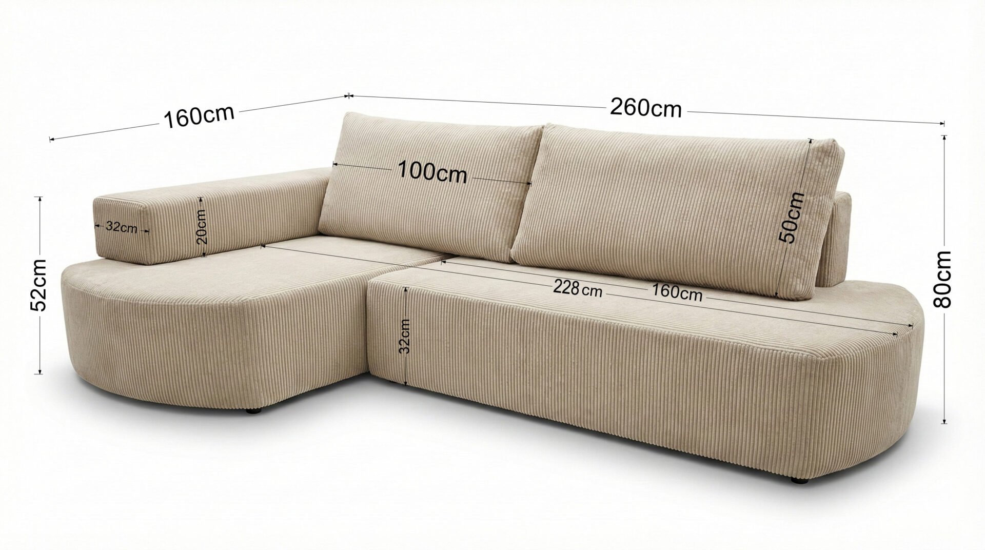 Tapicerka wykonana z wysokiej jakości, miękkiej tkaniny sztruksowej o wyraźnej strukturze nadaje narożnikowi przytulny wygląd i podkreśla jego nowoczesny styl. Materiał jest przyjemny w dotyku, trwały i łatwy w codziennym użytkowaniu, dzięki czemu mebel zachowuje estetyczny wygląd przez długi czas.