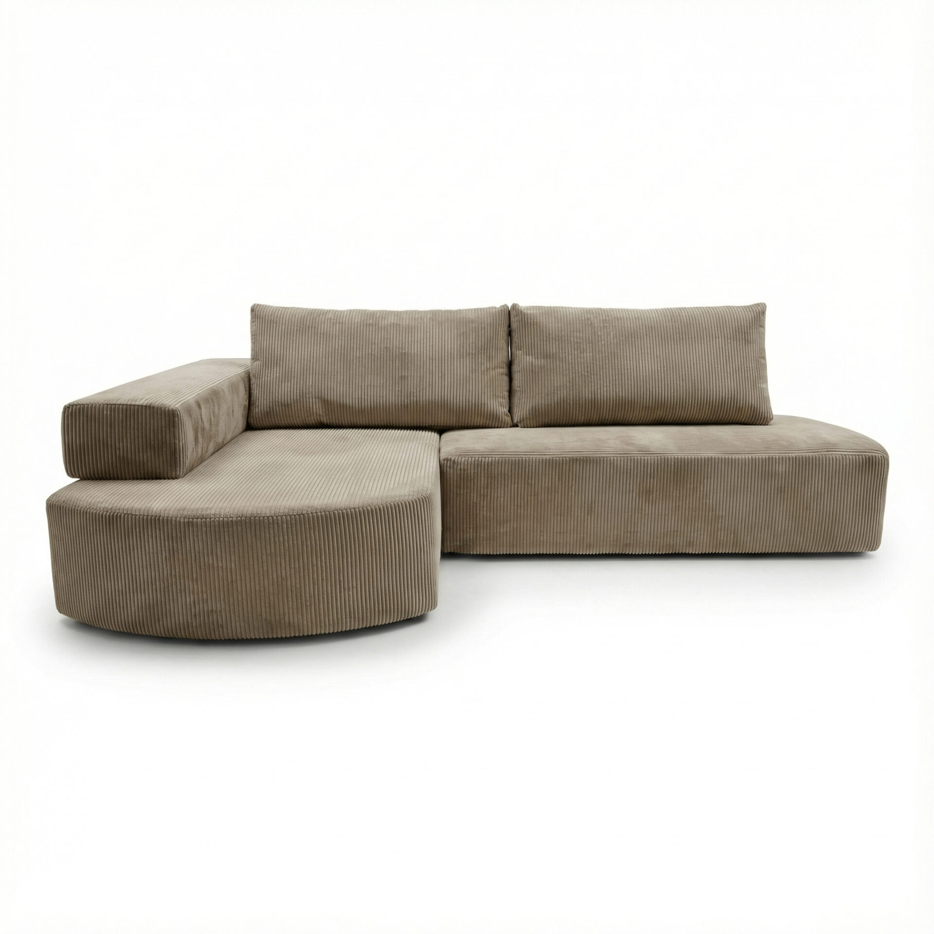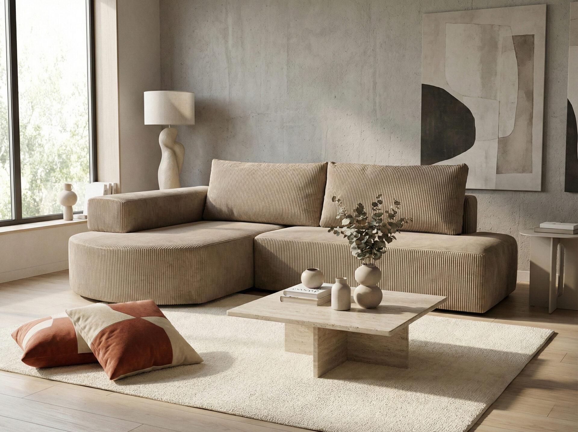 Tapicerka z miękkiej tkaniny sztruksowej o wyraźnej strukturze nadaje narożnikowi przytulny wygląd i podkreśla jego nowoczesny styl. Materiał jest przyjemny w dotyku i dobrze sprawdza się w codziennym użytkowaniu.