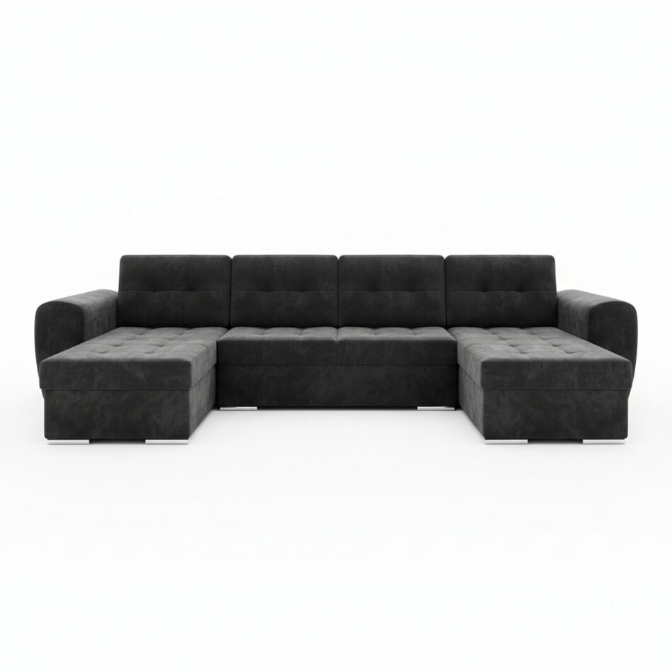 Jego symetryczna, szeroka bryła stanie się centralnym punktem każdego salonu. Wprowadza do wnętrza atmosferę elegancji i porządku. Grafitowy odcień tapicerki jest ponadczasowy i uniwersalny. Dlatego doskonale odnajdzie się zarówno w nowoczesnych, jak i klasycznie urządzonych przestrzeniach. Subtelne chromowane nóżki dodają całości lekkości. Co ważne, tapicerowany tył mebla pozwala na dowolne ustawienie go w pokoju. Może on stać na środku, efektownie oddzielając strefę relaksu od reszty pomieszczenia.