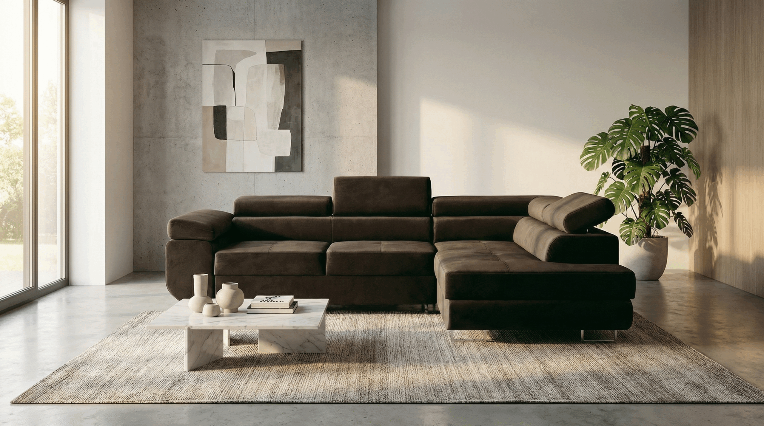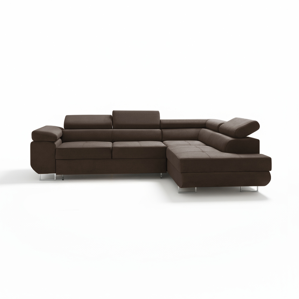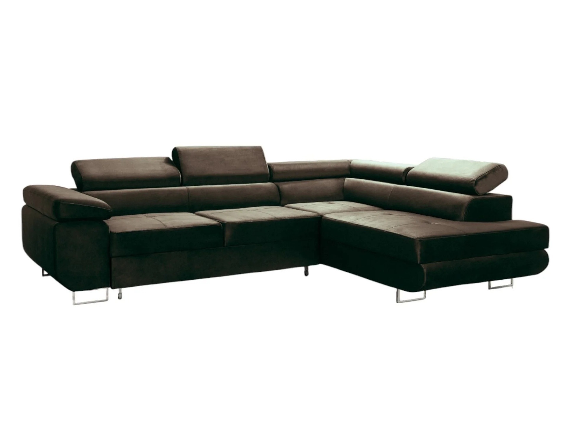 Jego wyrazisty, geometryczny kształt w literę L idealnie wpisuje się w przestronne wnętrza. Wysokie, chromowane nóżki dodają konstrukcji wizualnej lekkości i podkreślają jej współczesny charakter. Głęboki, czekoladowy odcień brązu wprowadza do salonu atmosferę ciepła i spokoju. Dlatego narożnik Avesta staje się doskonałą bazą dla aranżacji w stylu nowoczesnym, loftowym czy klasycznym. Tapicerowany tył mebla pozwala na swobodne ustawienie go w dowolnym miejscu, nawet na środku pokoju.