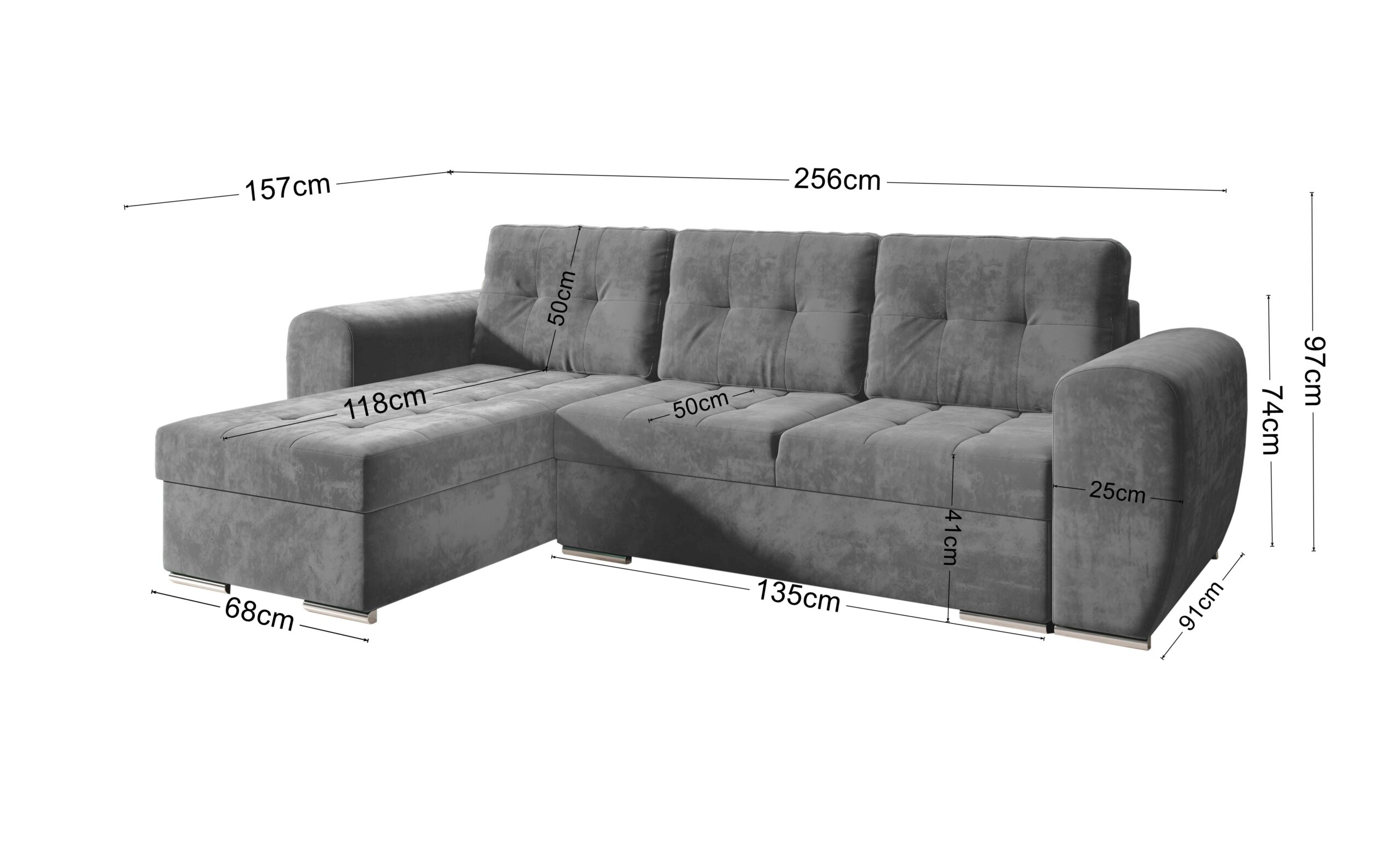 Jego klasyczna bryła w kształcie litery L doskonale komponuje się z różnymi aranżacjami. Pasuje zarówno do wnętrz nowoczesnych, jak i tych o bardziej tradycyjnym charakterze. Granatowa tapicerka z weluru dodaje głębi i tworzy przytulną atmosferę. Dzięki temu salon staje się idealnym miejscem do wieczornego relaksu. Całość osadzono na niskich, chromowanych nóżkach, które subtelnie podkreślają jego szlachetny wygląd. Co ważne, tapicerowany tył pozwala swobodnie ustawić mebel w dowolnym miejscu pokoju.
