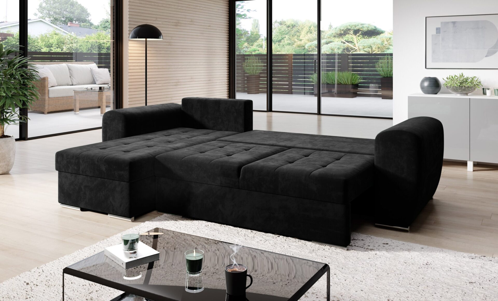 Narożnik Bari to również mebel niezwykle funkcjonalny. Posiada intuicyjną funkcję spania, aktywowaną przez rozkładanie za pomocą automatu DL. W kilka chwil salon zmienia się w komfortową sypialnię dla gości. Obszerny pojemnik na pościel pomaga z kolei utrzymać porządek. Można w nim schować dodatkowe koce i poduszki, zwalniając miejsce w szafie.
