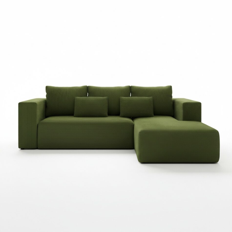 Jego L-kształtny układ subtelnie wyznacza strefę wypoczynku w salonie. Głęboki odcień khaki wprowadza do pomieszczenia atmosferę spokoju i bliskości z naturą. Dlatego doskonale komponuje się z drewnem, bielą oraz dodatkami w kolorach ziemi. Mięsista faktura sztruksu dodaje całości przytulnego charakteru. Co ważne, tapicerowany tył mebla pozwala na dowolne ustawienie go w przestrzeni, także na środku pokoju.