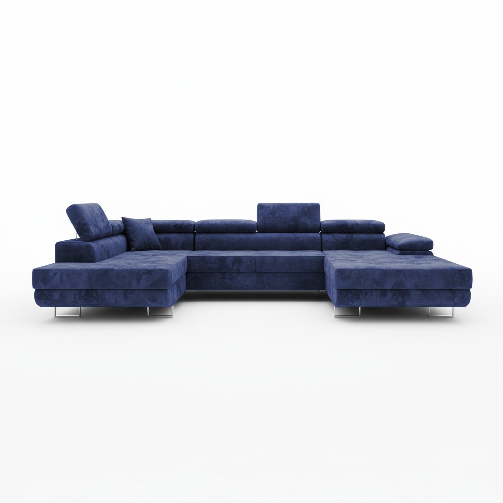 Jego duży, symetryczny kształt w formie litery U tworzy w salonie strefę relaksu dla całej rodziny. Nowoczesny charakter bryły podkreślają wysokie, chromowane nóżki dodające jej wizualnej lekkości. Głęboki granat tapicerki wprowadza do wnętrza atmosferę elegancji i spokoju. Ten szlachetny kolor pięknie prezentuje się w jasnych, przestronnych pomieszczeniach w stylu nowoczesnym lub glamour. Co ważne, tapicerowany tył mebla pozwala na dowolne ustawienie go w aranżacji.