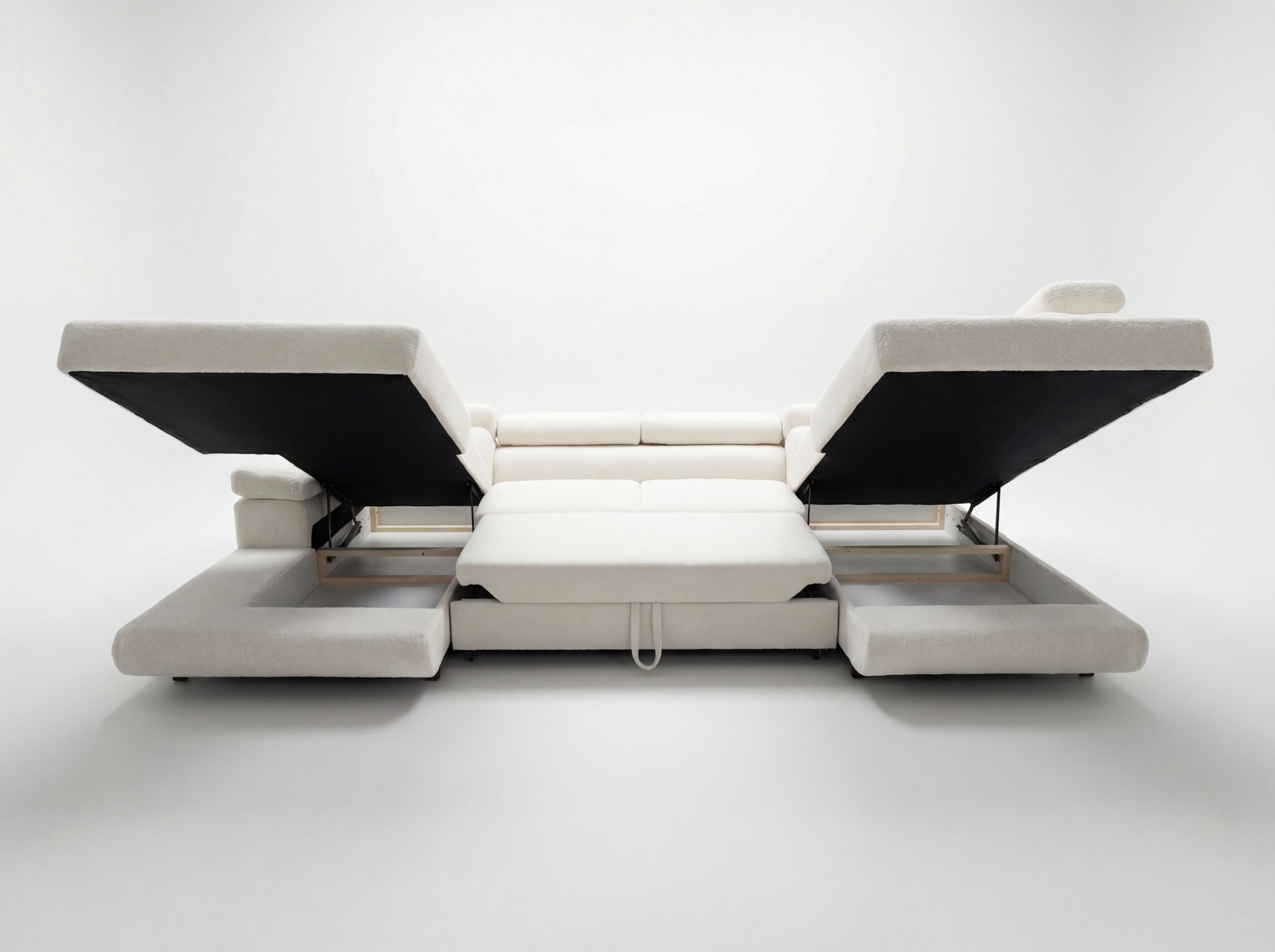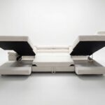 Model wyposażono w intuicyjną funkcję spania. Jej rozkładanie za pomocą automatu Delfin jest szybkie i nie wymaga wysiłku. Można więc w mgnieniu oka przygotować komfortowe miejsce dla gości. Praktycznym rozwiązaniem jest również pojemnik na pościel, który umożliwia przechowywanie dodatkowych koców i poduszek, pomagając utrzymać porządek w salonie. Co ważne, tapicerka Bouclé jest trwała i przyjazna użytkowaniu – jej struktura nadaje wnętrzu przytulny charakter i jest odporna na codzienne zabrudzenia.