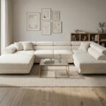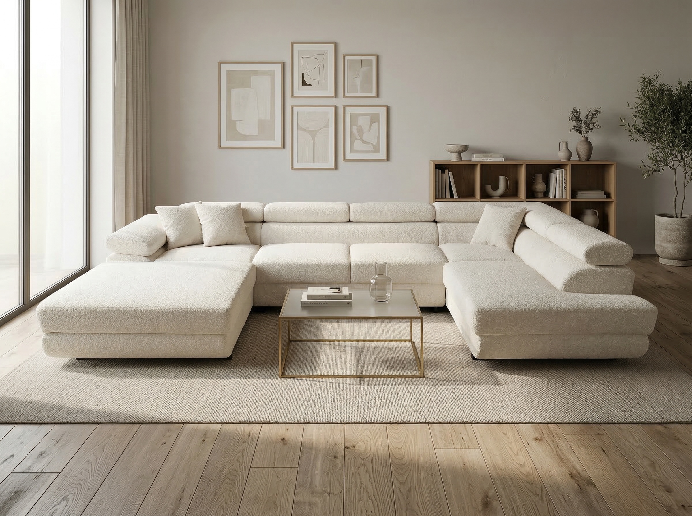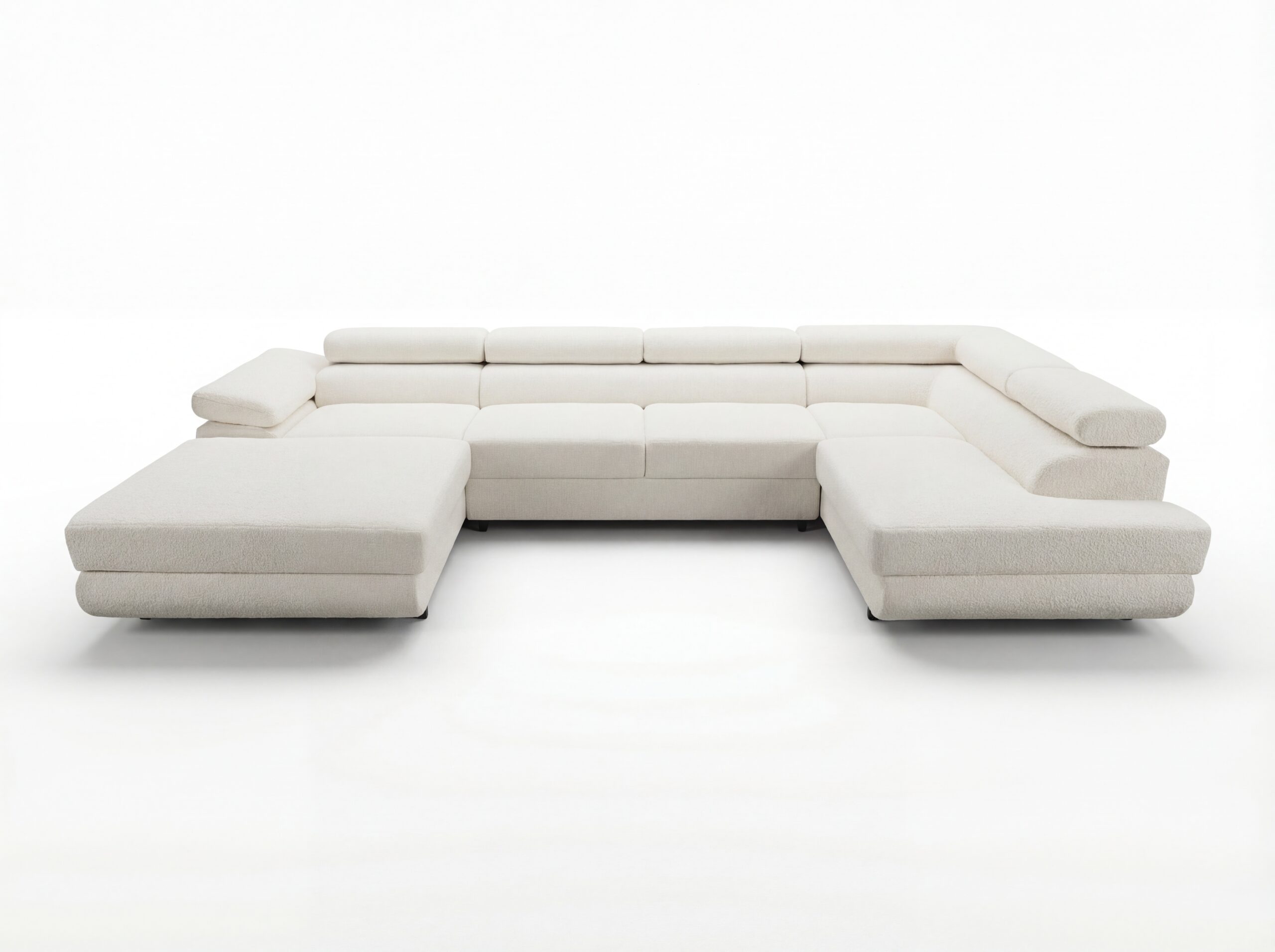 Jego przestronny układ w kształcie litery U tworzy idealne centrum domowego życia. Z łatwością gromadzi całą rodzinę podczas wspólnych wieczorów filmowych lub spotkań z przyjaciółmi. Jasny, kremowy odcień tkaniny Bouclé wprowadza do wnętrza atmosferę lekkości i elegancji. Dlatego doskonale komponuje się z nowoczesnymi, skandynawskimi oraz minimalistycznymi aranżacjami. Całość wspiera się na wysokich, czarnych metalowych nóżkach, które dodają konstrukcji lekkości.