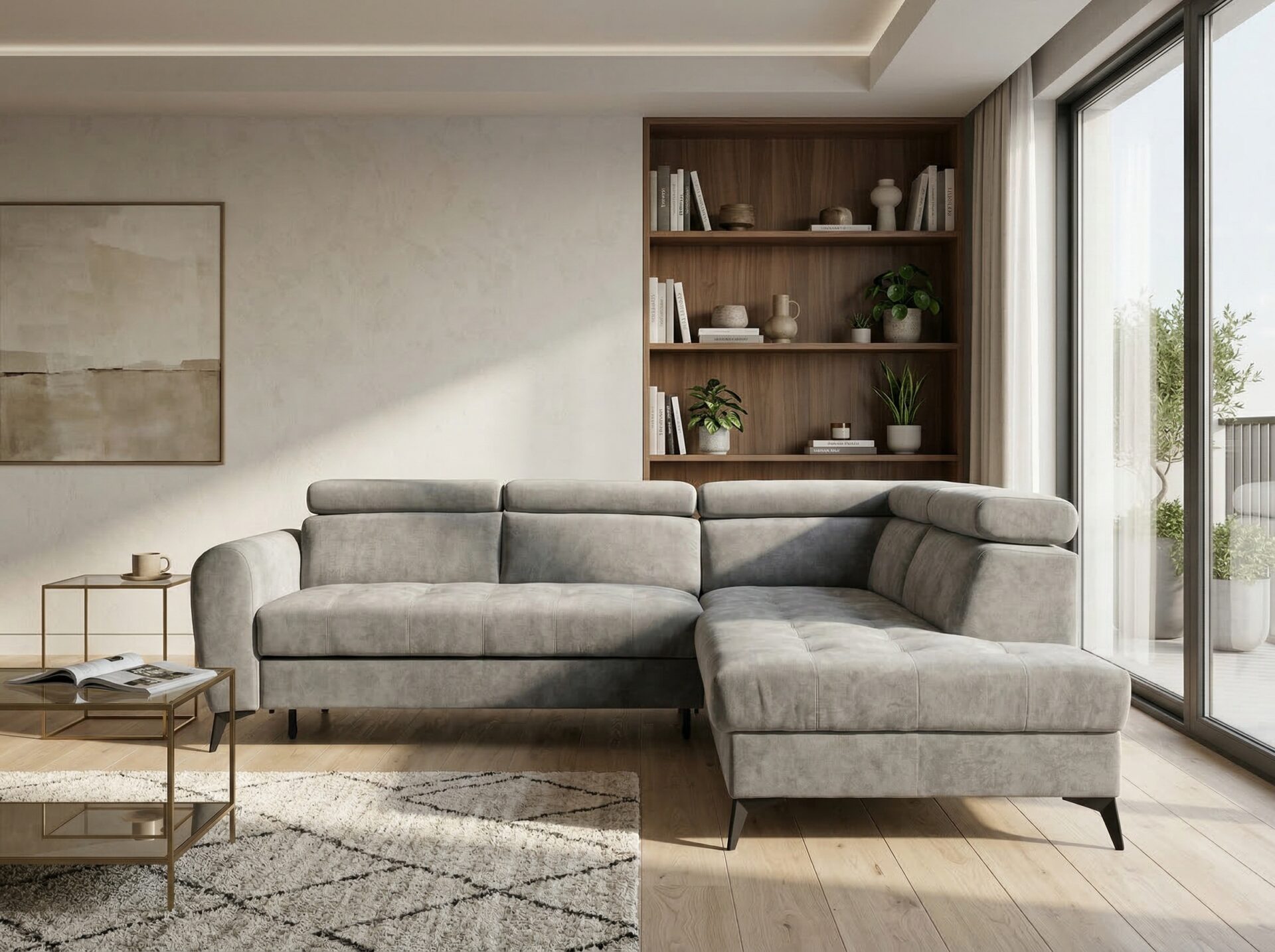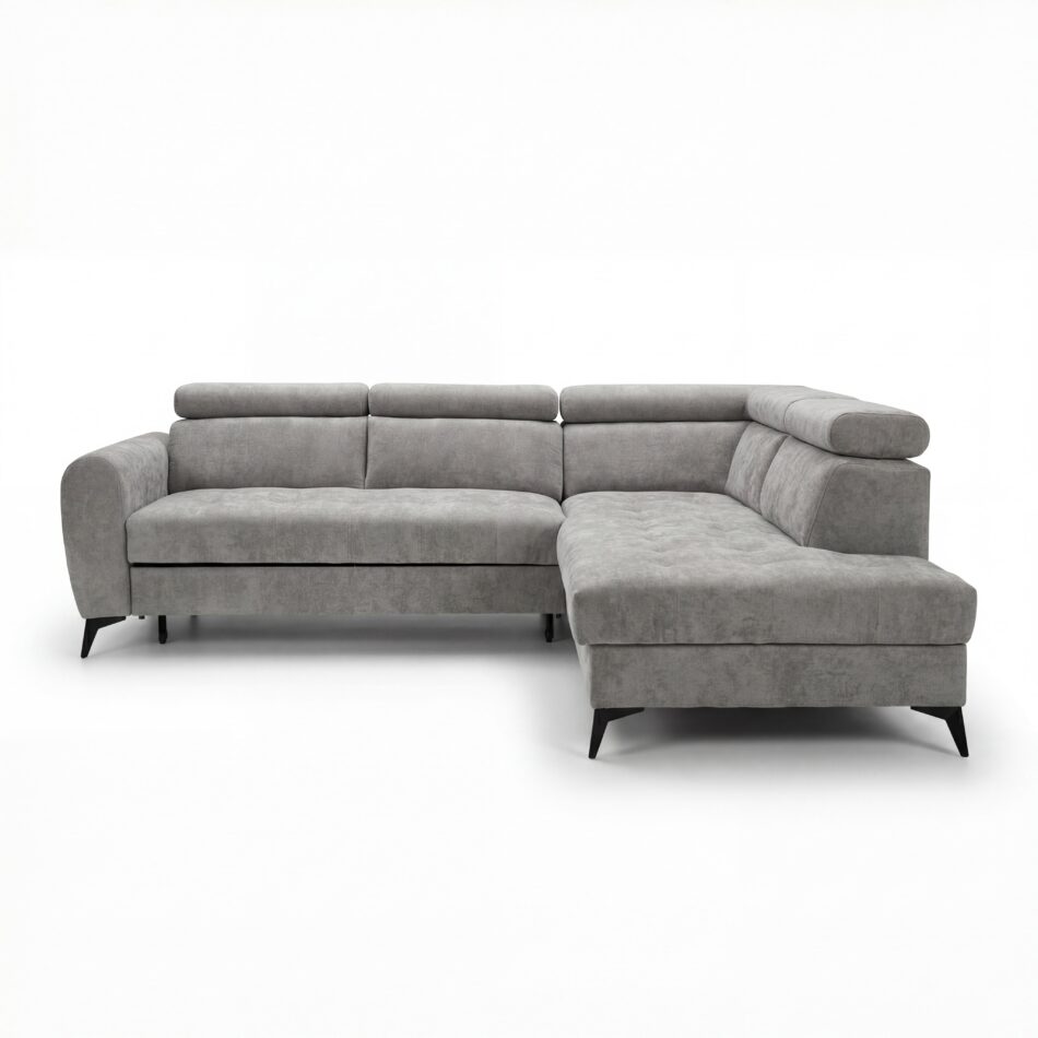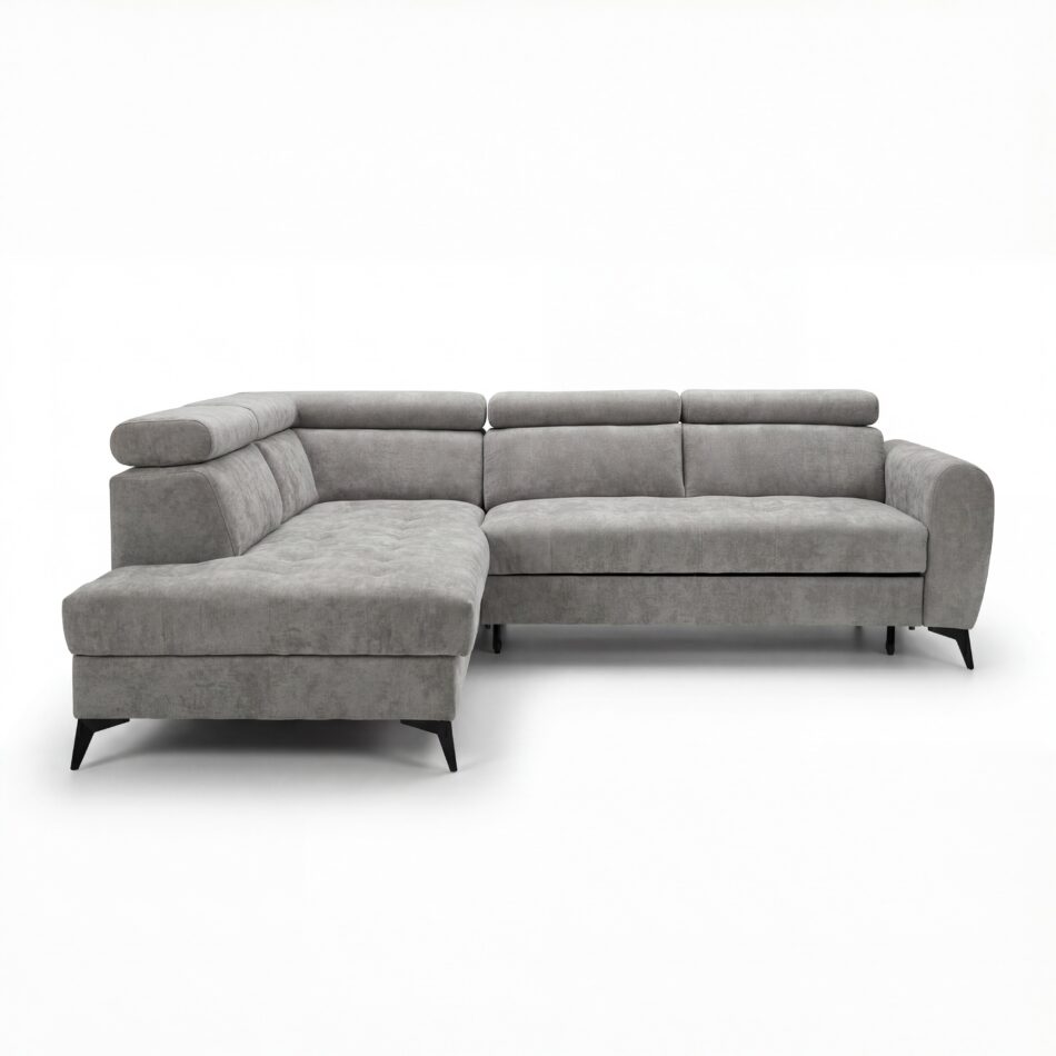 Wygodne siedzisko wypełniono sprężynami falistymi oraz elastyczną pianką, co zapewnia stabilne podparcie podczas codziennego wypoczynku. Regulowane zagłówki pozwalają dopasować oparcie do indywidualnych potrzeb. Dzięki temu można wygodnie oprzeć głowę podczas czytania książki lub wieczornego seansu filmowego. Narożnik wyposażono również w intuicyjną funkcję spania. Rozkładanie za pomocą automatu Delfin jest szybkie i nie wymaga wysiłku. Pojemny schowek na pościel pomaga z kolei utrzymać porządek w salonie każdego dnia.