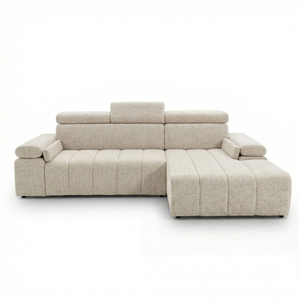 Na szczególną uwagę zasługują regulowane zagłówki oraz podłokietniki, które pozwalają dopasować ustawienie mebla do indywidualnych potrzeb użytkownika – zarówno podczas siedzenia, jak i relaksu w pozycji półleżącej. Komfort użytkowania podnoszą również modne przeszycia, które nadają całości charakteru i podkreślają nowoczesny styl narożnika.