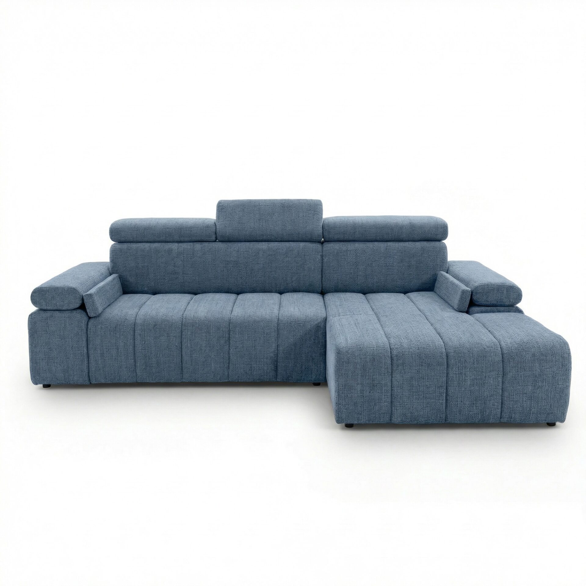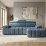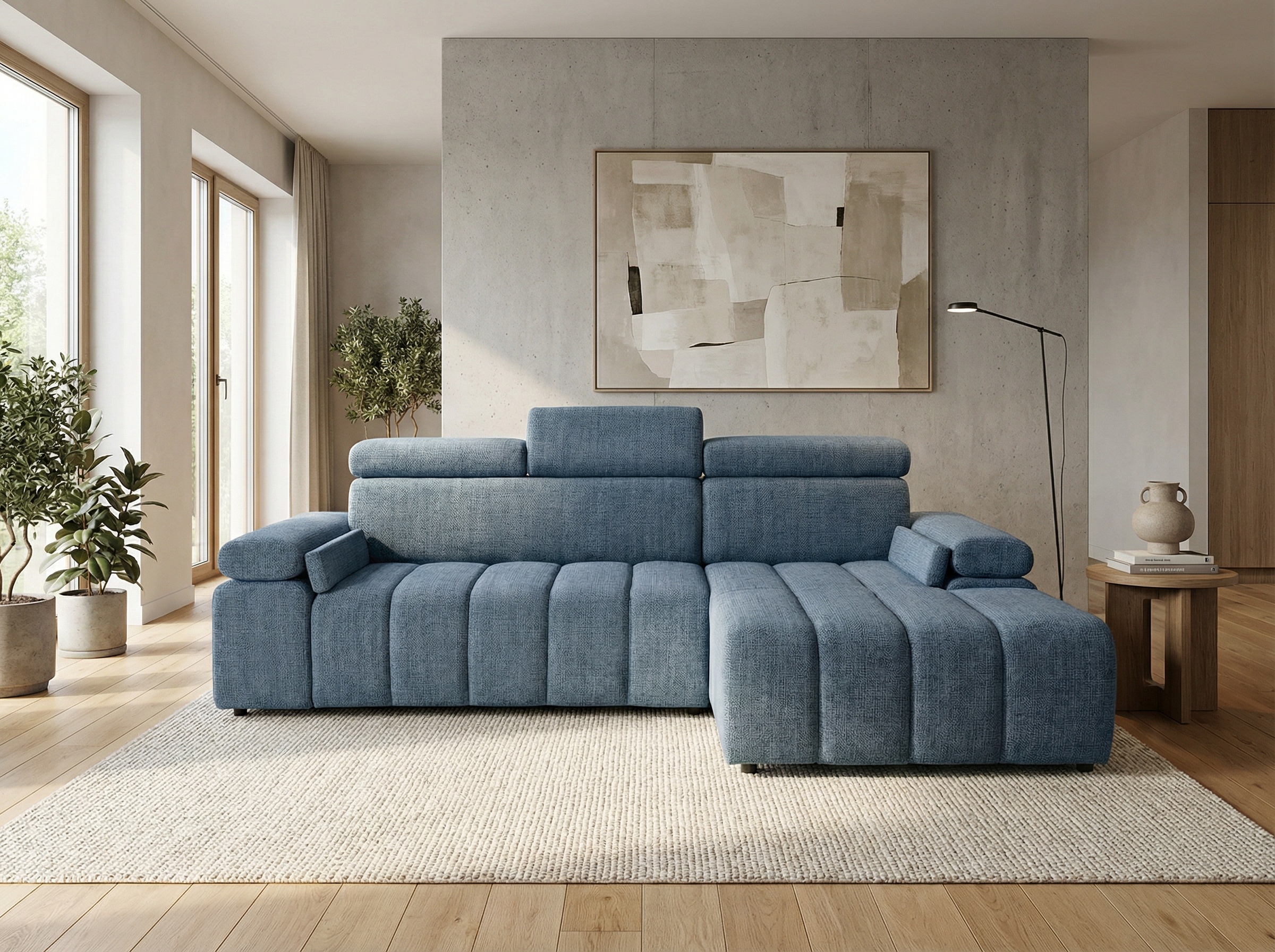 Narożnik z funkcją spania Calm prawostronny L-kształtny niebieski szenil