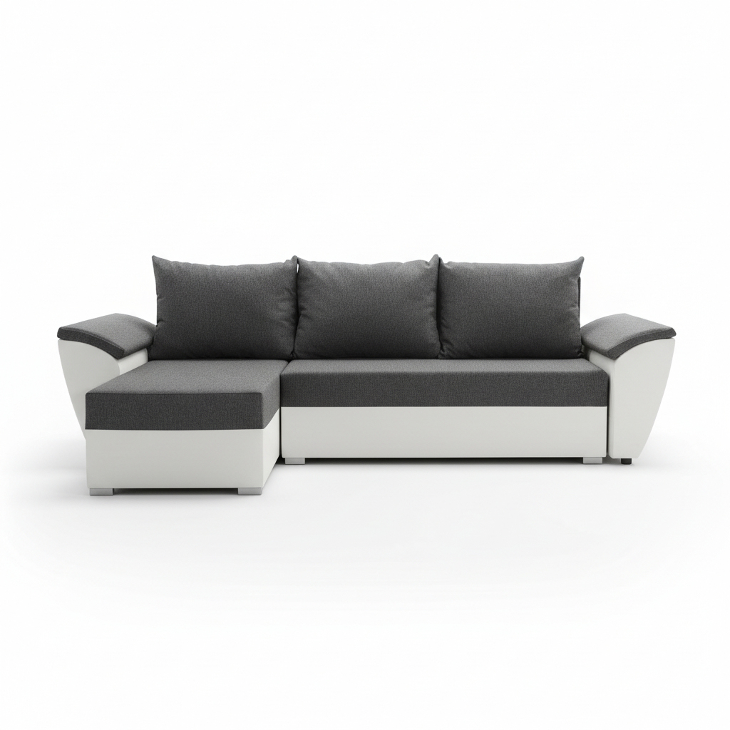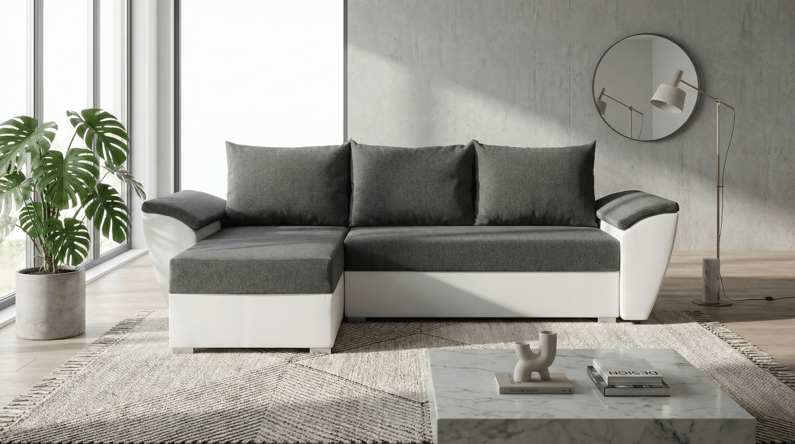 Elegancki narożnik Fly w szaro-białym odcieniu wprowadza do wnętrza ponadczasowy styl.