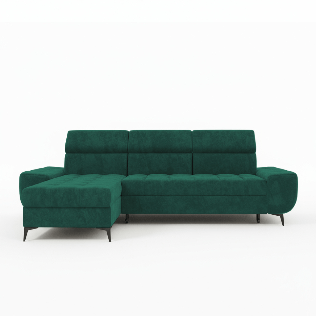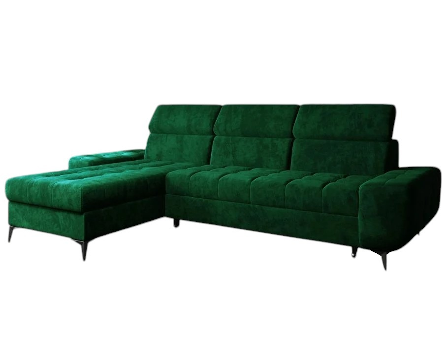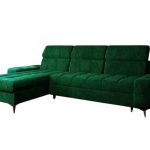 Jego nowoczesna bryła w kształcie litery L idealnie organizuje przestrzeń. Wysokie, czarne metalowe nóżki dodają jej wizualnej lekkości. Głęboki odcień butelkowej zieleni tworzy we wnętrzu przytulny i spokojny nastrój. Kolor ten doskonale komponuje się z elementami drewna, złota oraz neutralnymi barwami. Co ważne, tapicerowany tył mebla pozwala na ustawienie go w dowolnym miejscu pokoju.