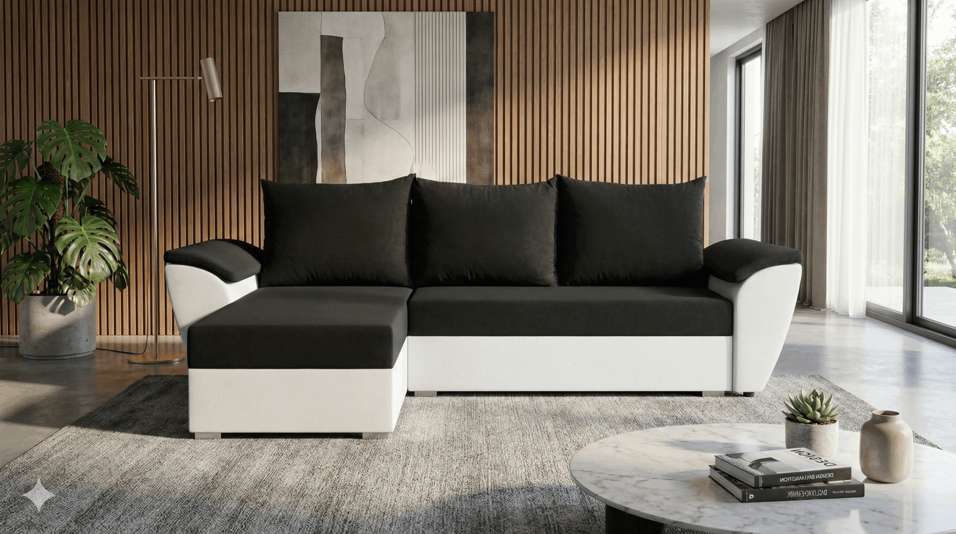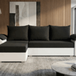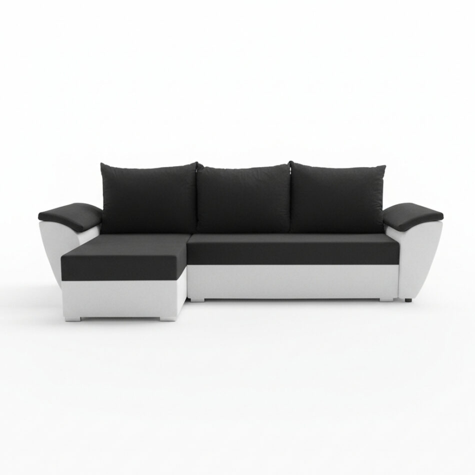 Jego kompaktowa forma w kształcie litery L świetnie organizuje przestrzeń w salonie. Kontrastowe zestawienie czerni i bieli tworzy odważny, dynamiczny efekt wizualny. Dlatego narożnik doskonale wpisuje się w aranżacje minimalistyczne i nowoczesne. Całość opiera się na niskich, chromowanych nóżkach, które dodają konstrukcji subtelnej elegancji. Tapicerowany tył pozwala z kolei na ustawienie mebla w dowolnym miejscu pokoju.