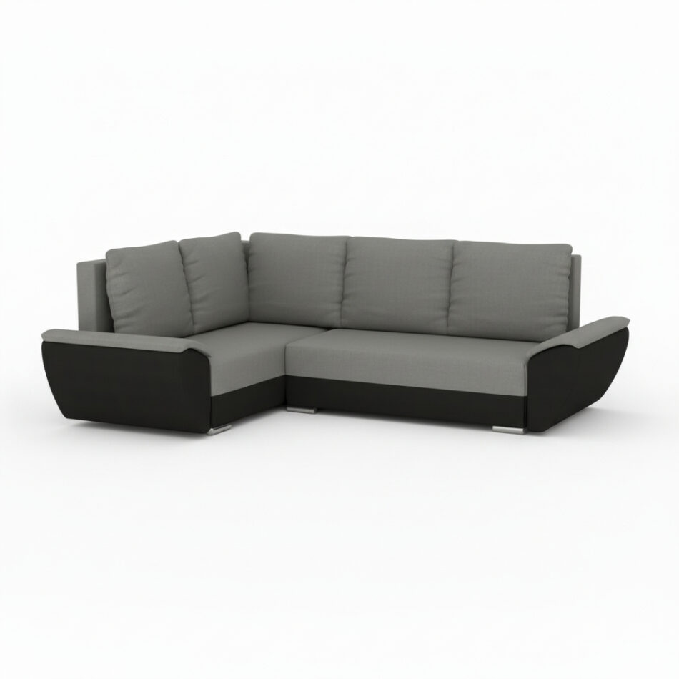 Jego ponadczasowy wygląd z łatwością dopasuje się do nowoczesnych oraz klasycznych aranżacji. Mebel ma praktyczny kształt litery L. Dzięki temu naturalnie wyznacza strefę relaksu w salonie, stając się jego centralnym punktem. Połączenie szarości i czerni wprowadza do wnętrza spokój oraz elegancję. Taka kolorystyka stanowi doskonałą bazę dla wyrazistych dodatków lub uzupełnia minimalistyczny wystrój. Chromowane nóżki dodają całości subtelnej lekkości.