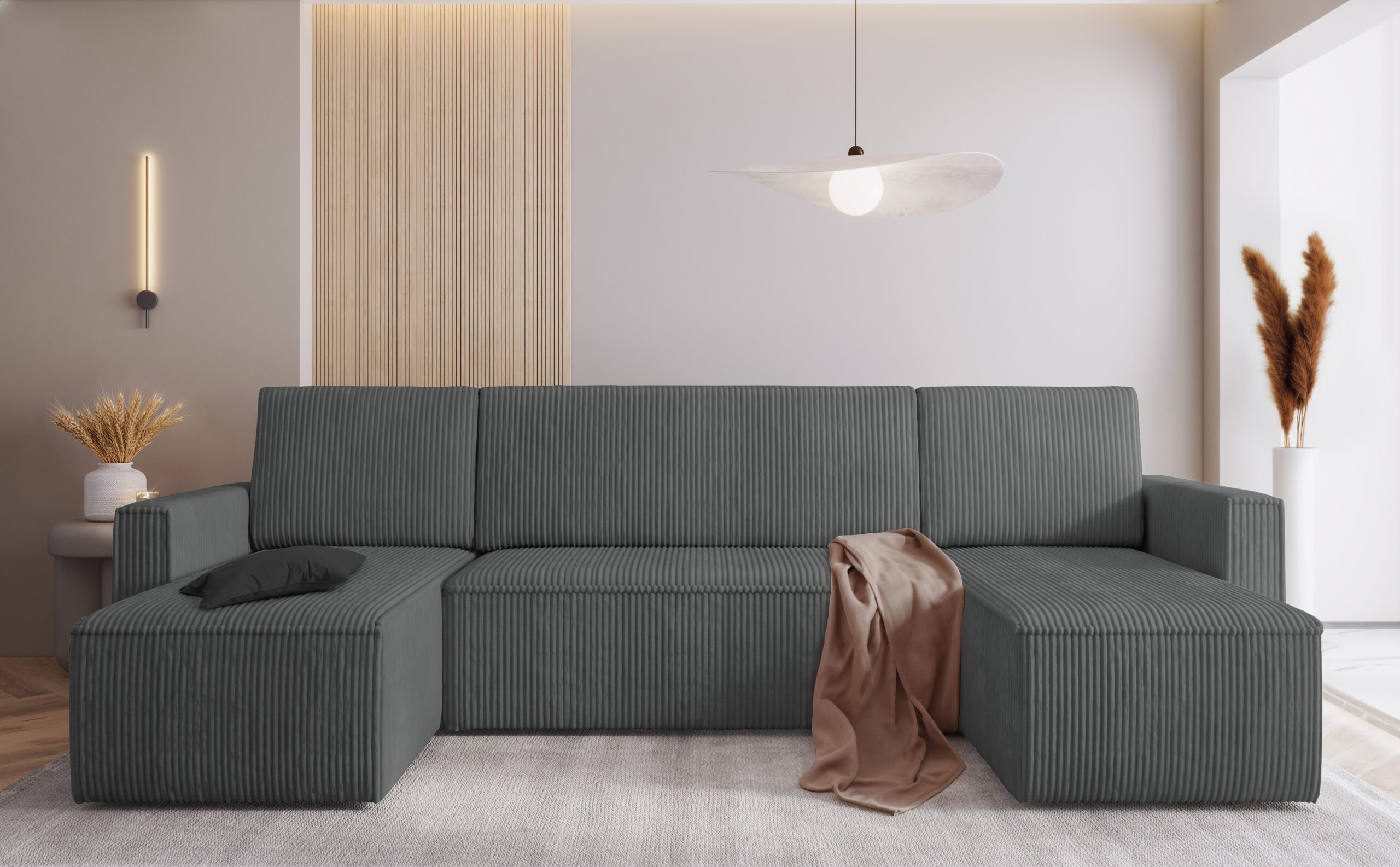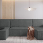 Jego symetryczny układ w kształcie litery U tworzy idealną przestrzeń do spotkań w gronie rodziny lub przyjaciół. Prosta bryła zyskuje wyjątkowy charakter dzięki prążkowanej fakturze tkaniny Poso. Dlatego narożnik świetnie odnajduje się we wnętrzach klasycznych oraz nowoczesnych. Szary odcień tapicerki optycznie rozjaśnia pomieszczenie. Wprowadza do niego atmosferę spokoju i ciepła. Co ważne, tapicerowany tył pozwala ustawić mebel w dowolnym miejscu salonu, na przykład na granicy strefy wypoczynkowej i jadalni.